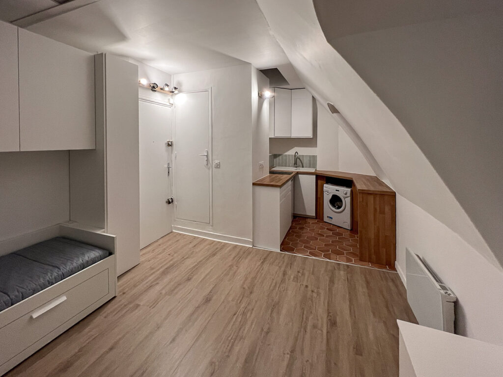 Ce studio de 16 m², au 6e étage d’un immeuble de 1900, a été entièrement réorganisé. Salle de bain refaite avec lave-linge 4 kg sous vasque, cuisine optimisée toute hauteur avec équipements intégrés, chauffe-eau et compteur dissimulés. Dans la pièce de vie, dressing déplacé et mobilier modulable pour libérer l’espace et profiter pleinement de la lumière et de la terrasse.