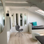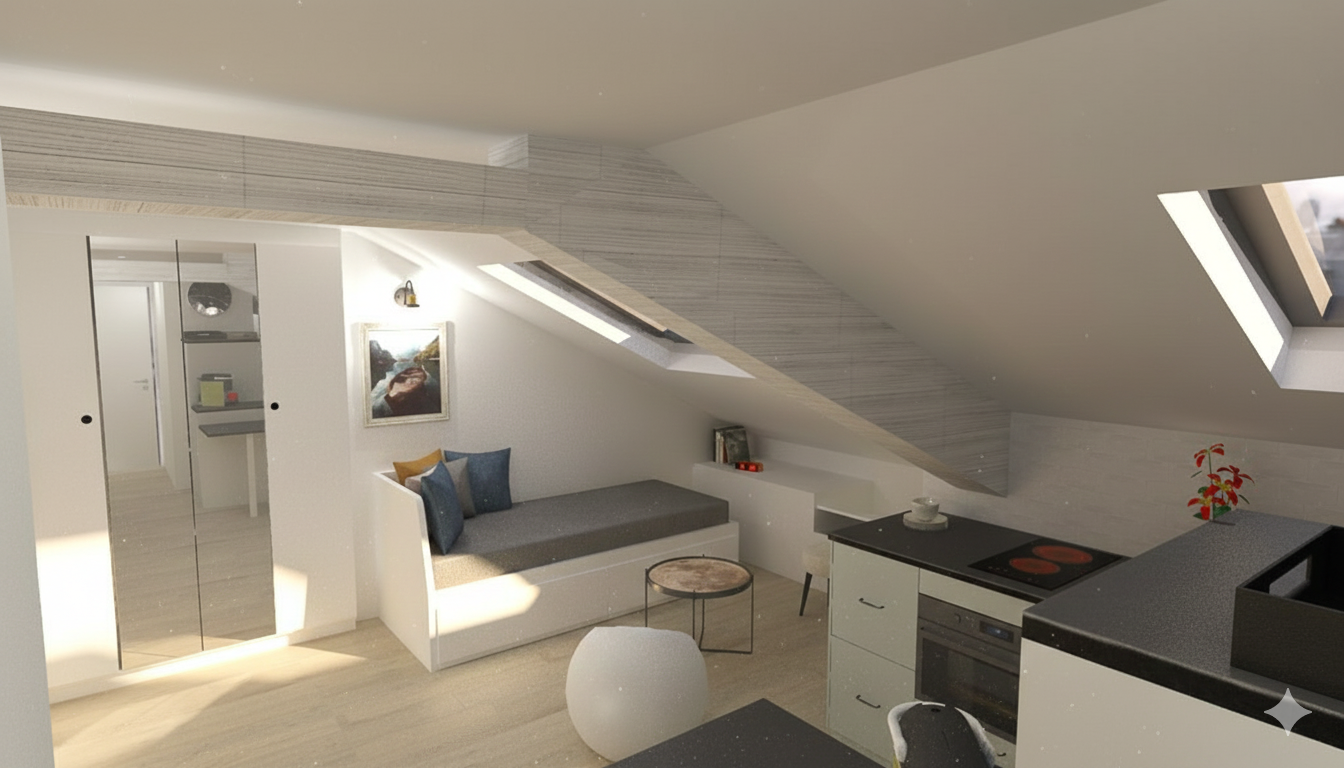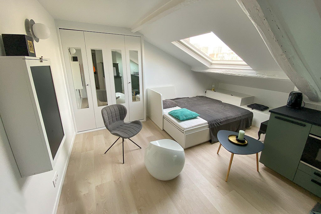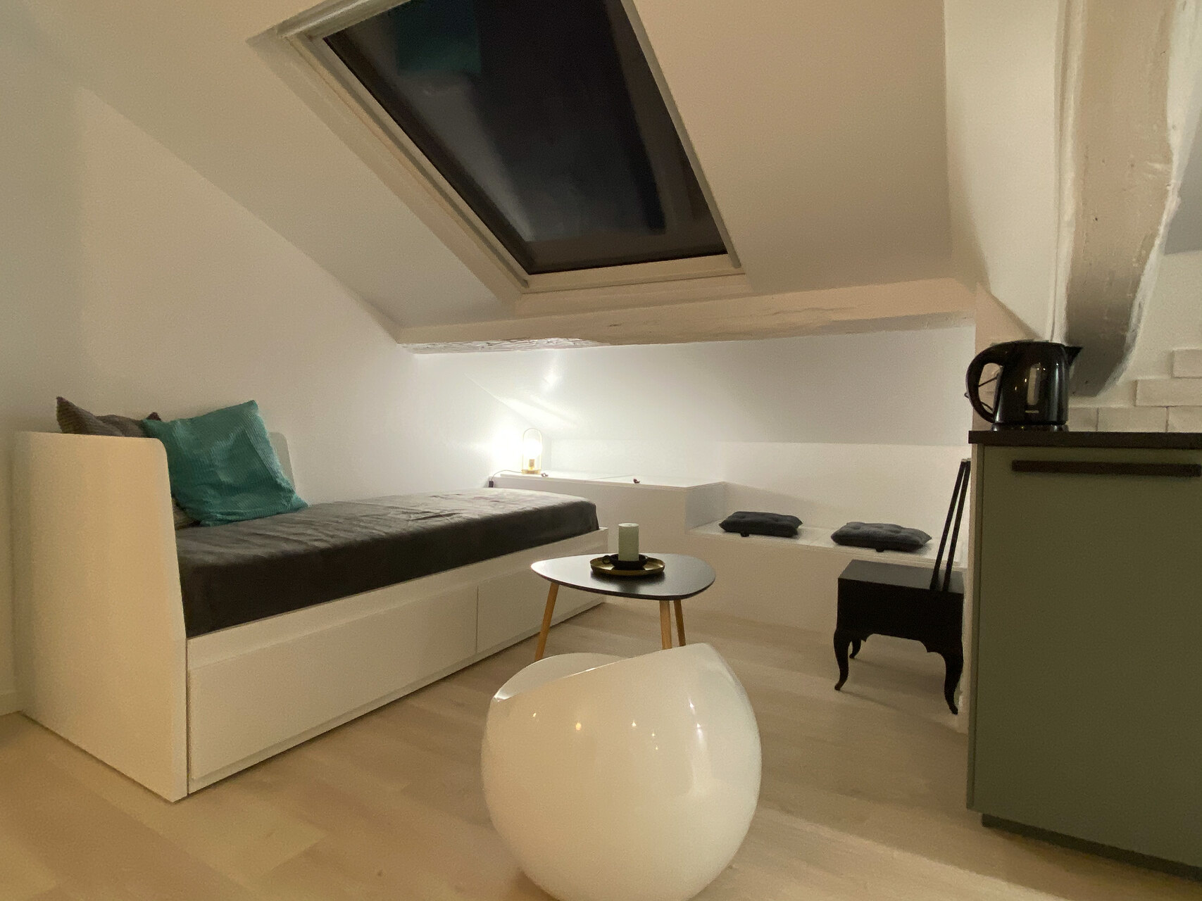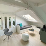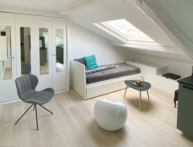Transformer un studio fortement mansardé en un bien locatif attractif et agréable à vivre : voilà l’objectif que nous ont assigné Ju* et Cy* en nous mettant ce projet entre les mains. Ceci assorti de quelques lignes directrices telles que l’optimisation de la luminosité, de l’agencement global, du confort de vie et le respect d’un budget serré.