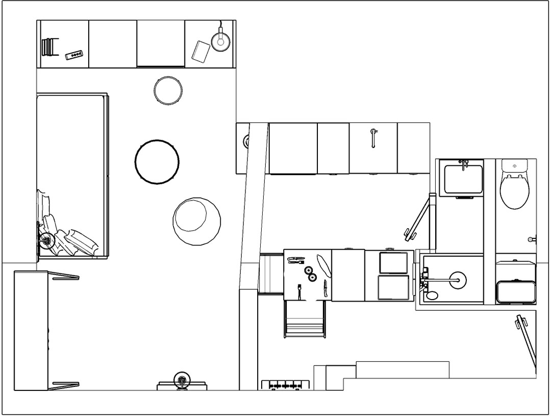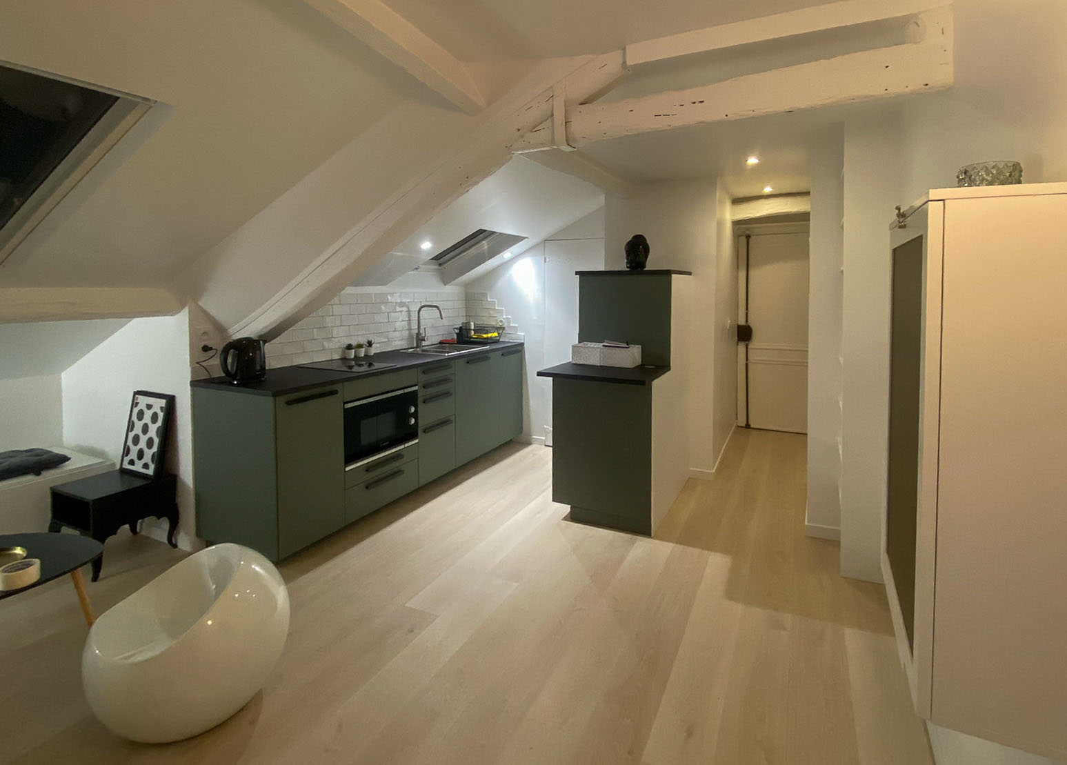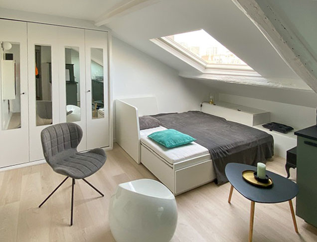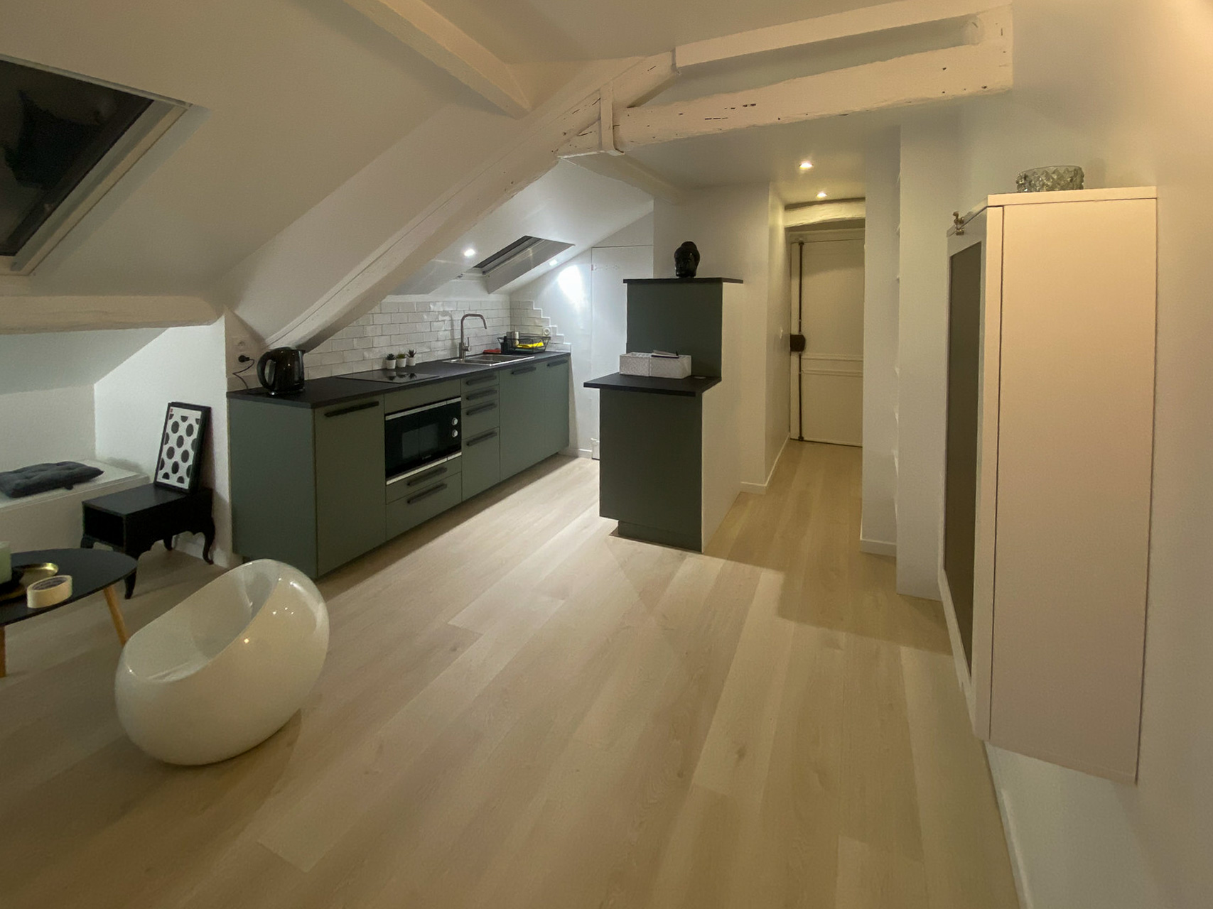 Transformer un studio fortement mansardé en un bien locatif attractif et agréable à vivre : voilà l’objectif que nous ont assigné Ju* et Cy* en nous mettant ce projet entre les mains. Ceci assorti de quelques lignes directrices telles que l’optimisation de la luminosité, de l’agencement global, du confort de vie et le respect d’un budget serré.