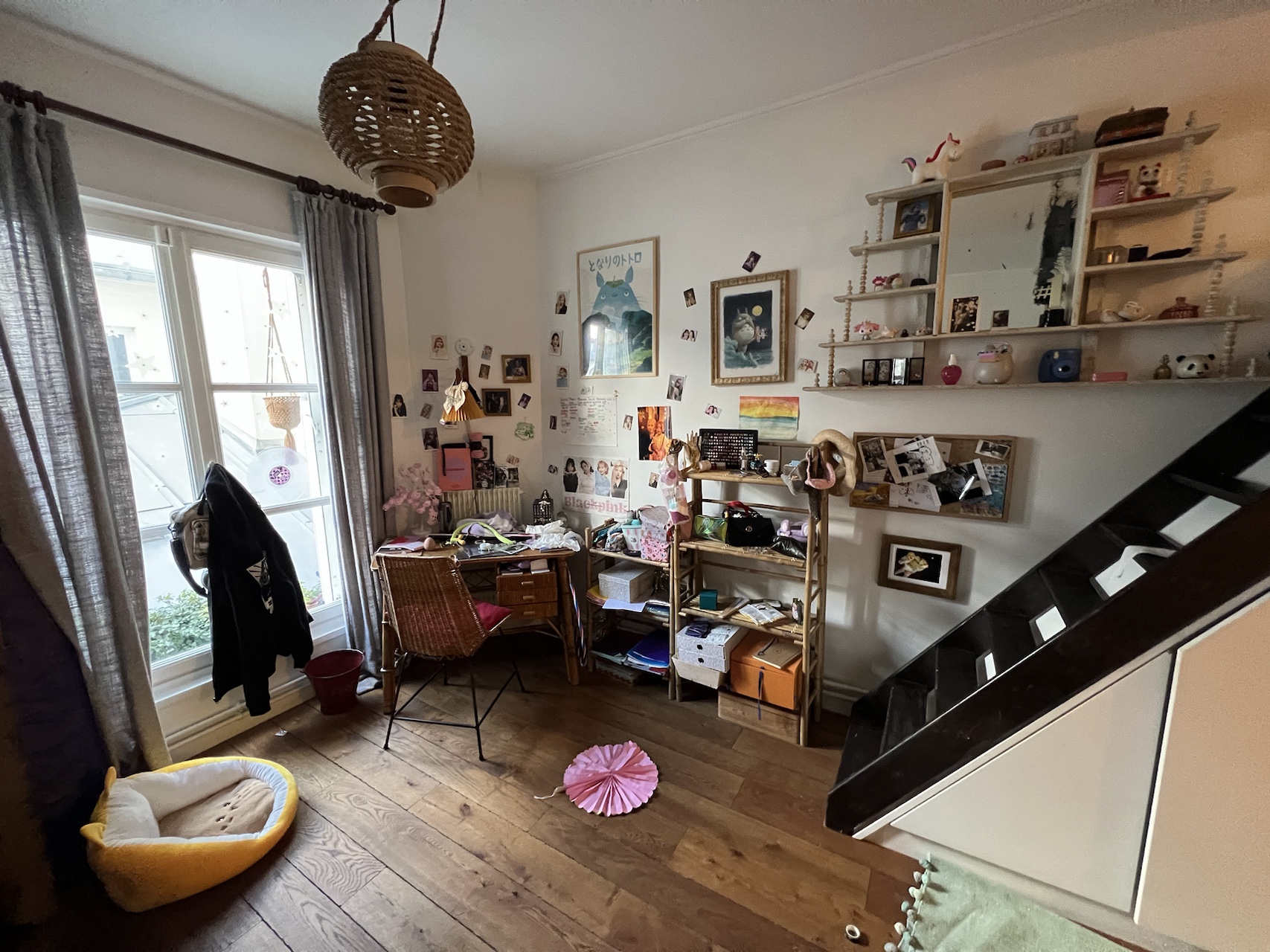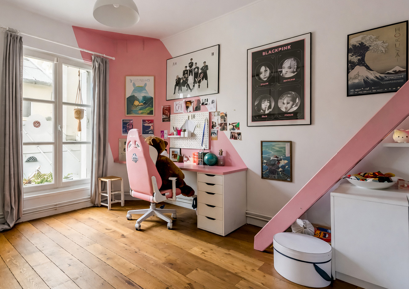 L’armoire ancienne est conservée mais encadrée de grands placards toute hauteur. Le rangement devient continu et absorbe les besoins d’une adolescente qui grandit. Un large bureau sur mesure complète l’ensemble. L’univers K-pop et kawaii est assumé, mais structuré par une architecture claire.