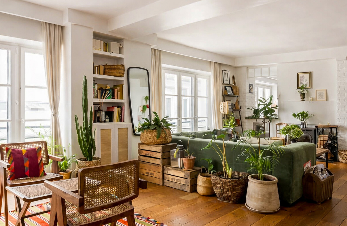 Lorsque nous rencontrons Vir* et Nie*, l’appartement fonctionne déjà. Installé au premier étage d’un immeuble donnant sur une cour aux anciennes devantures d’ateliers, le lieu raconte une histoire artisanale et végétale que le couple s’est appropriée au fil du temps.