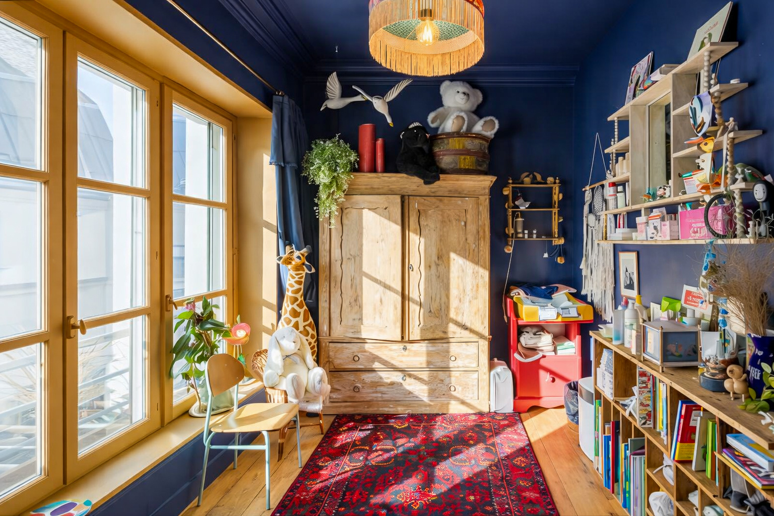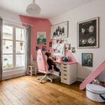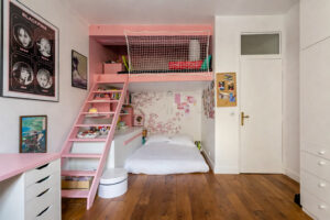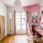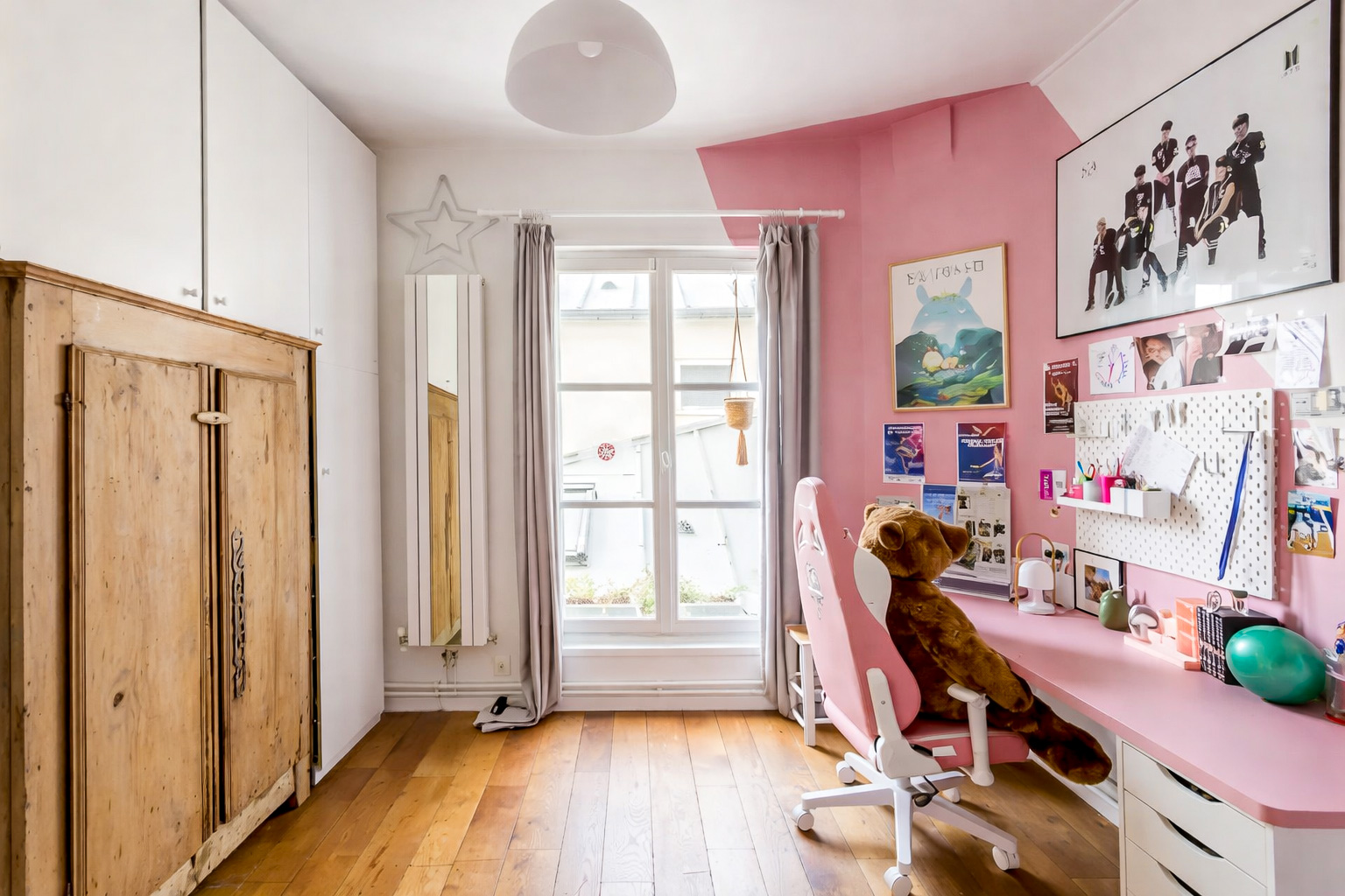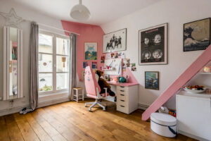 L’armoire ancienne est conservée mais encadrée de grands placards toute hauteur. Le rangement devient continu et absorbe les besoins d’une adolescente qui grandit. Un large bureau sur mesure complète l’ensemble. L’univers K-pop et kawaii est assumé, mais structuré par une architecture claire.
