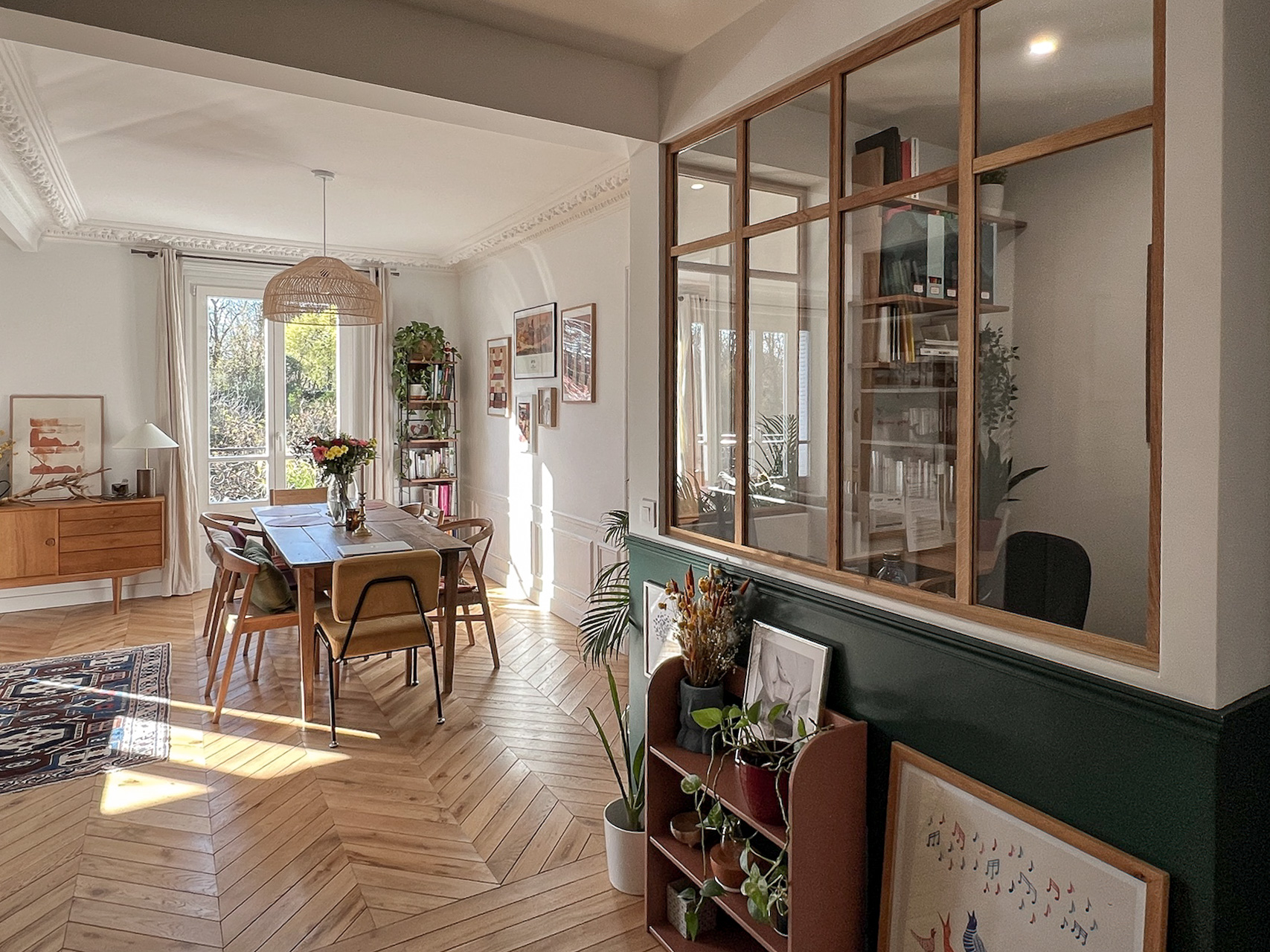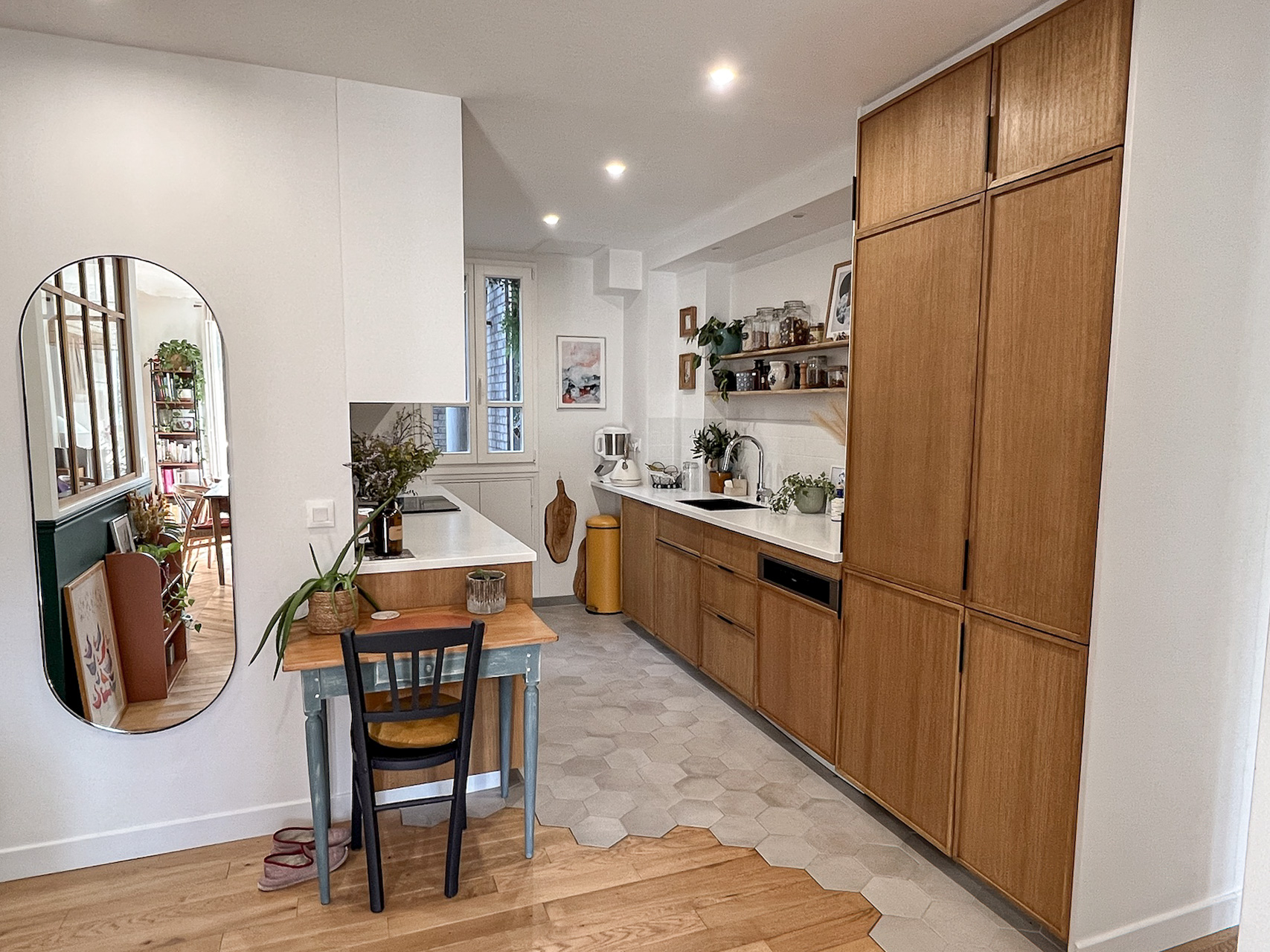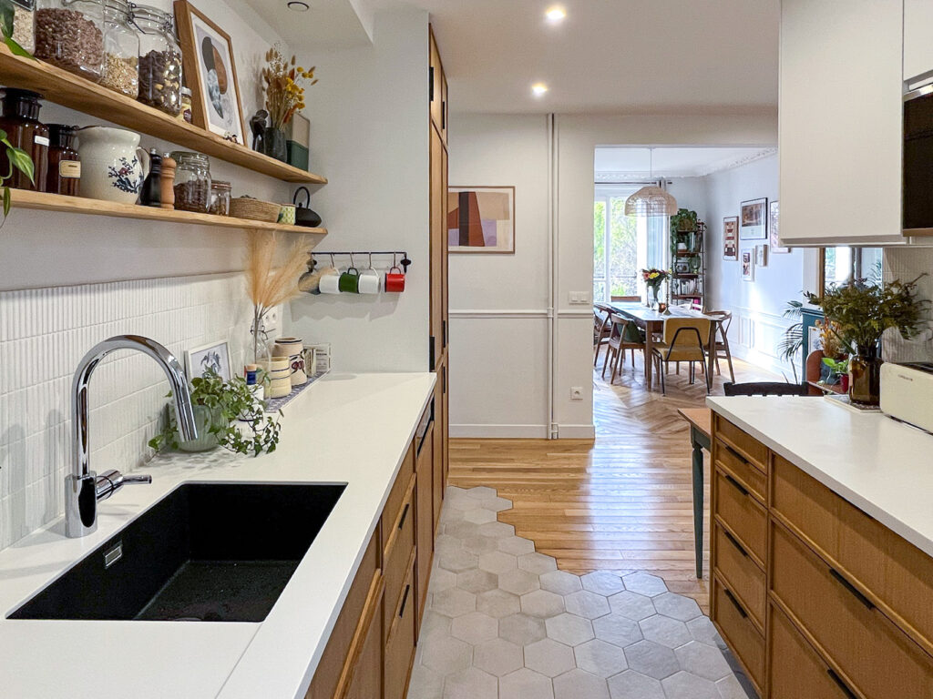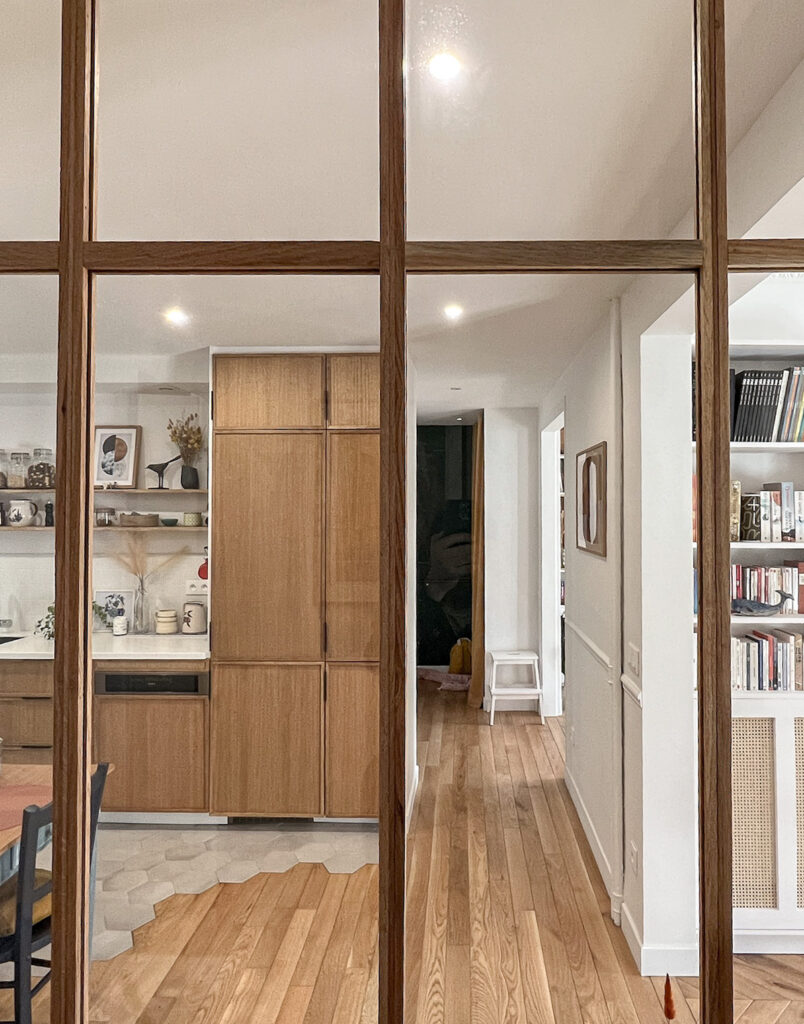 Plus qu’une simple rénovation, le projet a consisté à reprendre le plan en profondeur, à faire des choix structurants et à transformer cet appartement en un lieu adapté au quotidien d’une famille, tout en préservant le caractère haussmannien et en valorisant la relation directe avec les arbres du Père Lachaise.