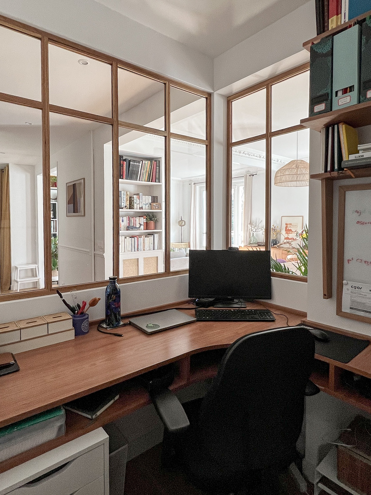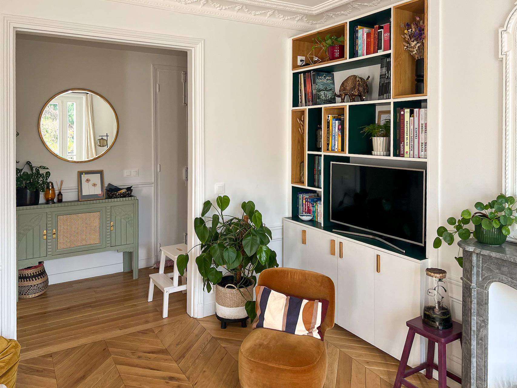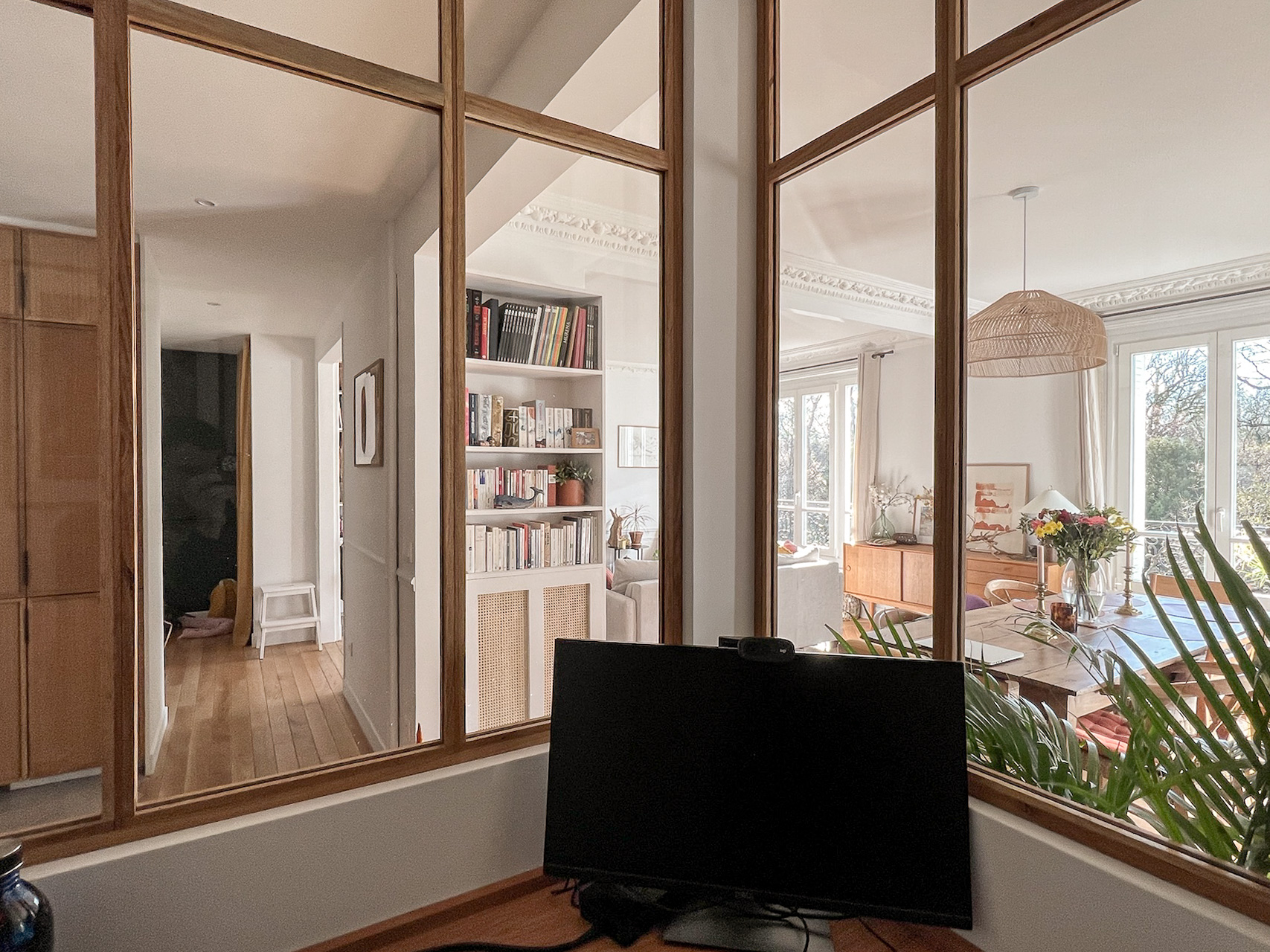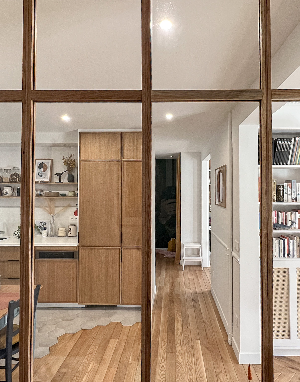 Associés à chaque étape du chantier, Ol* et Is* ont pu progressivement voir émerger un appartement à leur image : ouvert, lumineux et accueillant. Entièrement repensé et optimisé pour leur mode de vie, c’est un lieu à la fois classique et contemporain, tel que souhaité, dans lequel ils pouvaient projeter leur nouvelle vie. Outre les détails sur mesure, comme la verrière en bois et les bibliothèques, ils ont apprécié le soin apporté à la rénovation des éléments d’origine. Le bureau central, véritable coup de cœur, est devenu l’espace pivot du quotidien de la famille. Famille qui s’est enrichie d’un petit « locataire », dans la seconde chambre préparée à cet effet.