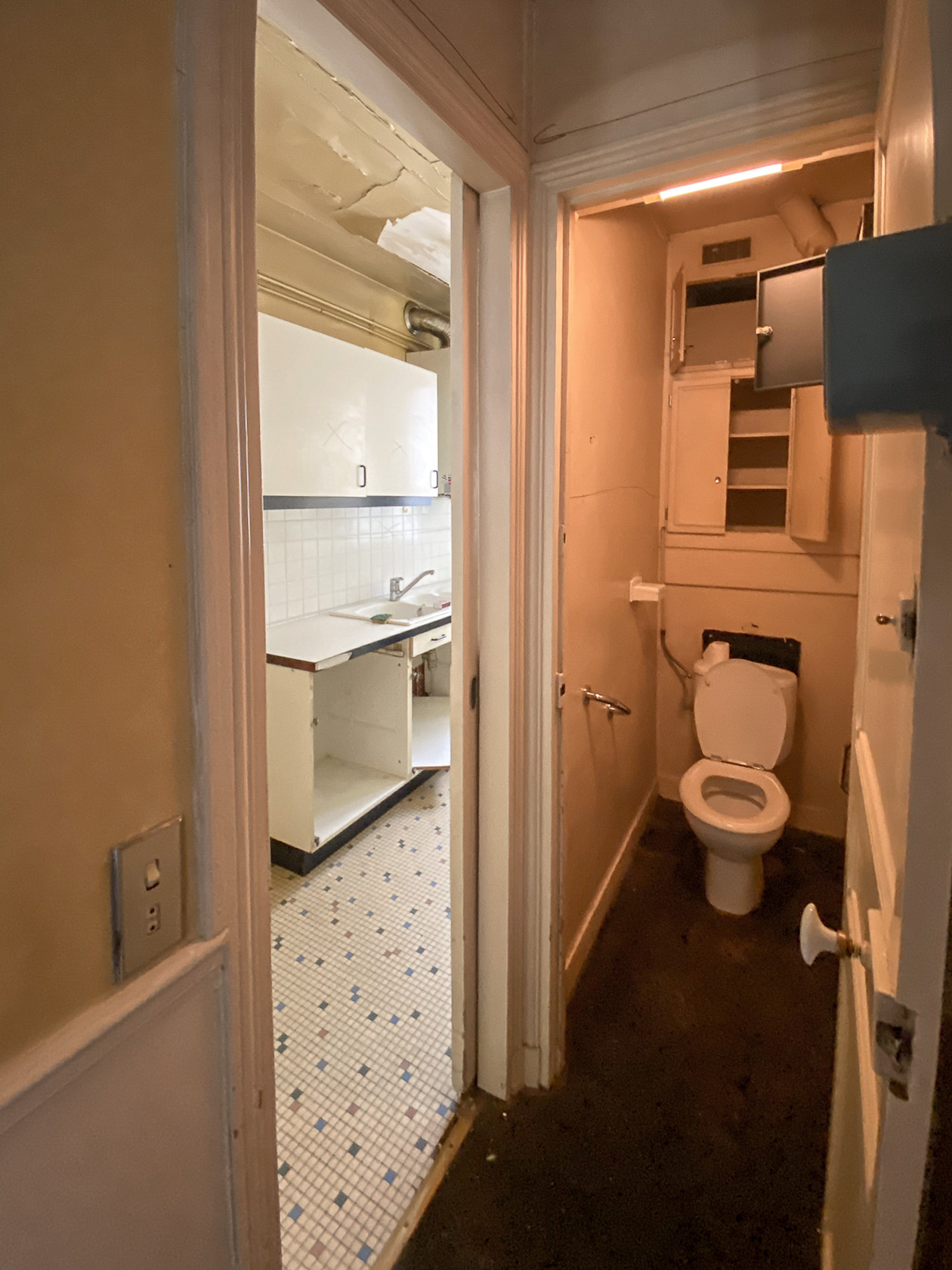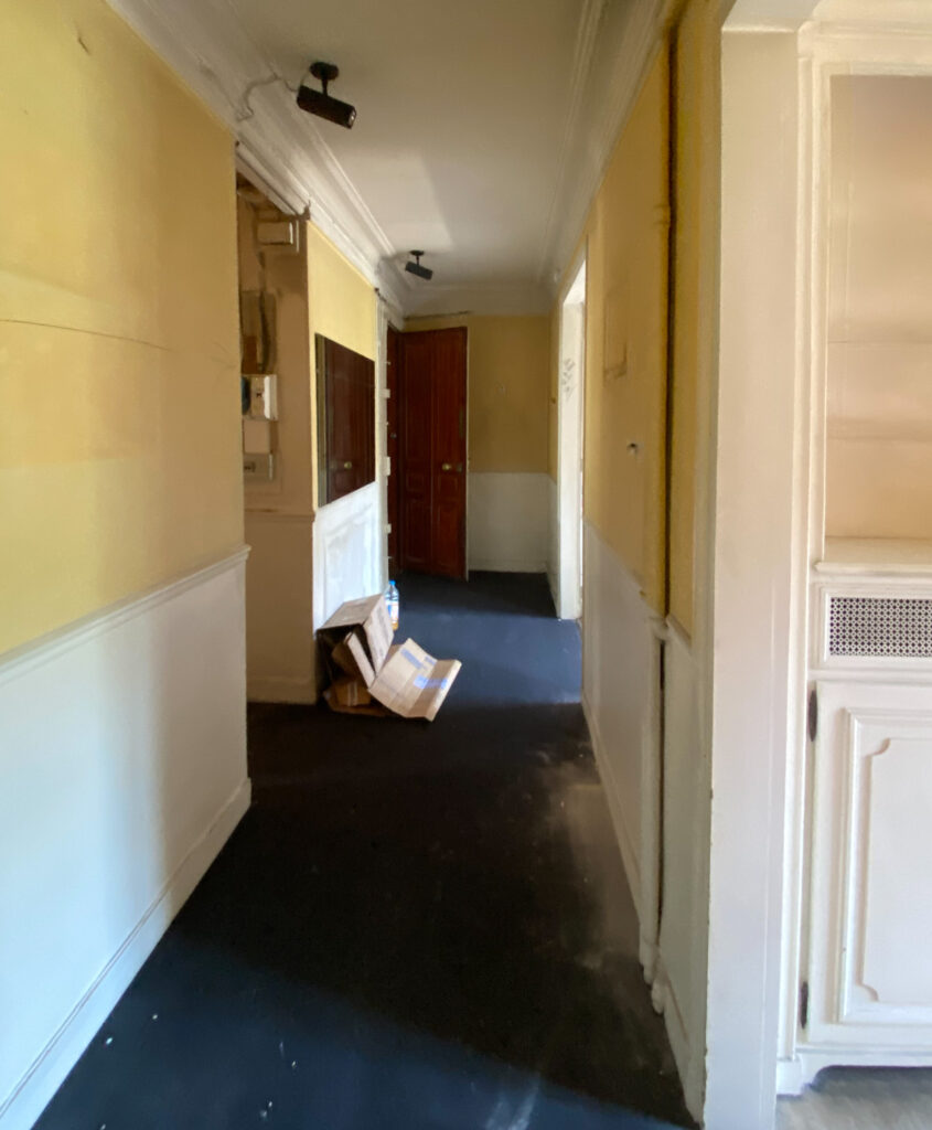Resté inchangé depuis plus de trente ans, cet appartement haussmannien de 86 m² conservait de beaux atouts architecturaux, mais une organisation intérieure devenue peu pertinente. Un long couloir central distribuait l’ensemble des pièces sans autre fonction que celle de relier, consommant inutilement de la surface et cloisonnant les usages.