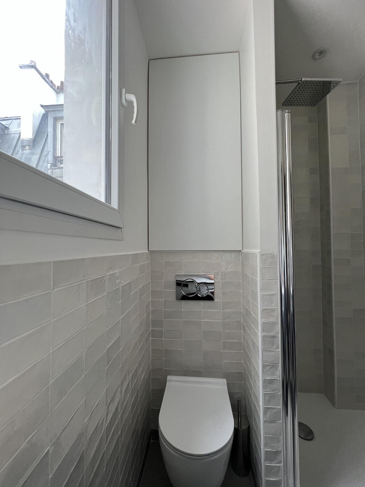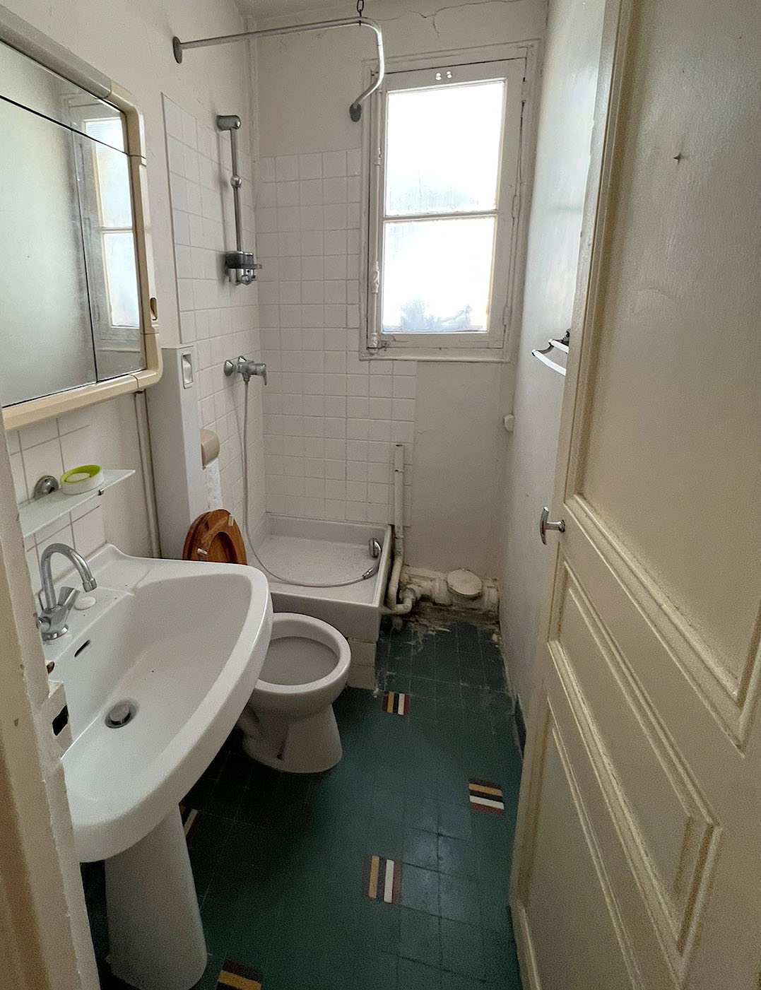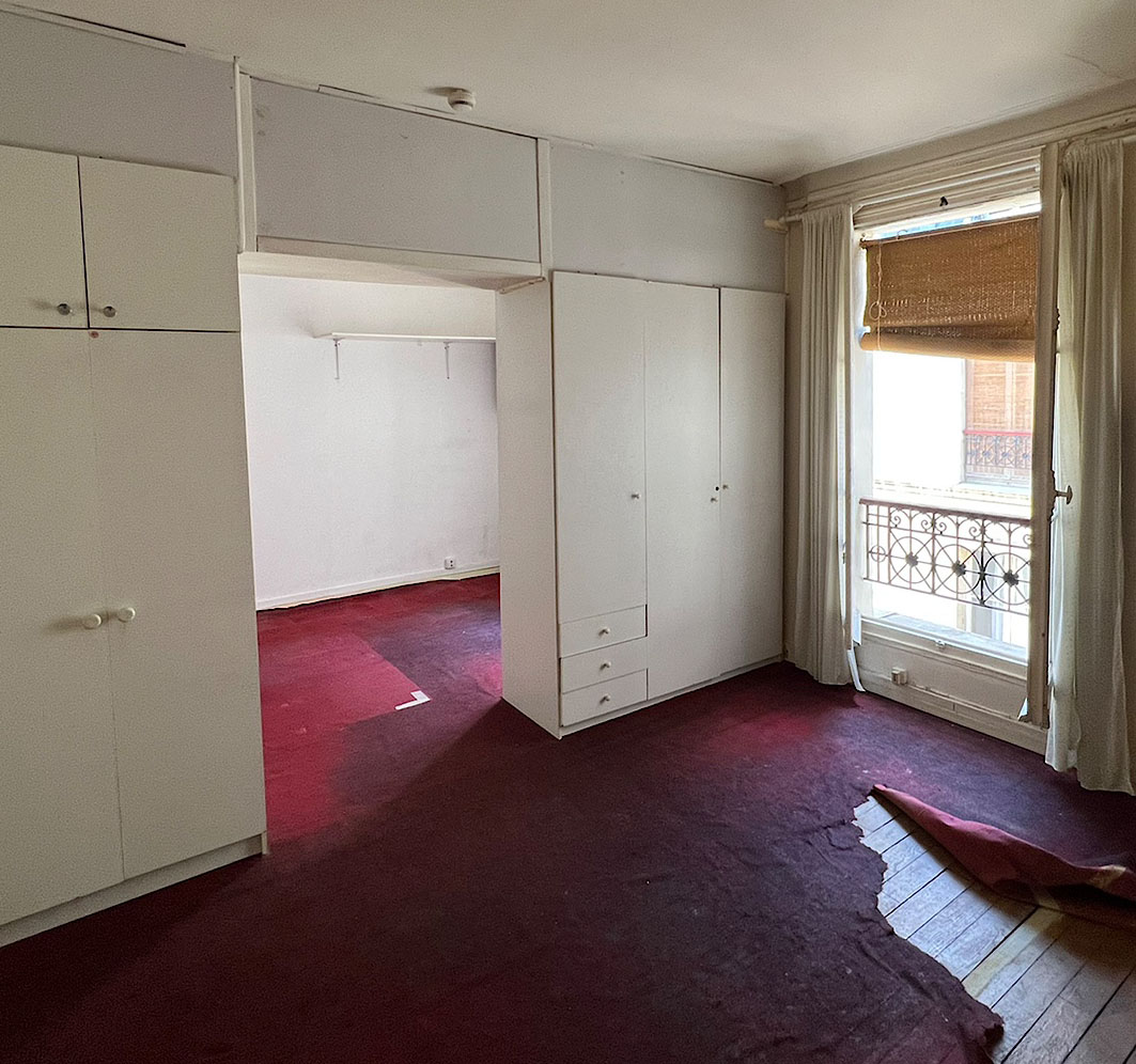 Ce studio parisien en forme de « L », au 5e étage en fond de cour et tout près de la Tour Eiffel, avait tout pour lui : traversant, lumineux, spacieux avec une belle hauteur sous plafond et une double exposition. Le potentiel était évident. Mais avec sa salle de bain vétuste, sa cuisine hors d’usage, ses toilettes sur le palier, sa distribution illisible et ses volumes étouffés, les enjeux en matière d’architecture d’intérieur étaient multiples. En outre, l’objectif affiché de notre client, un investisseur locatif doté d’une vraie stratégie, était de faire de ce logement un bien locatif positionné « haut de gamme » mais en conservant sa typologie, et donc son statut, de studio.
