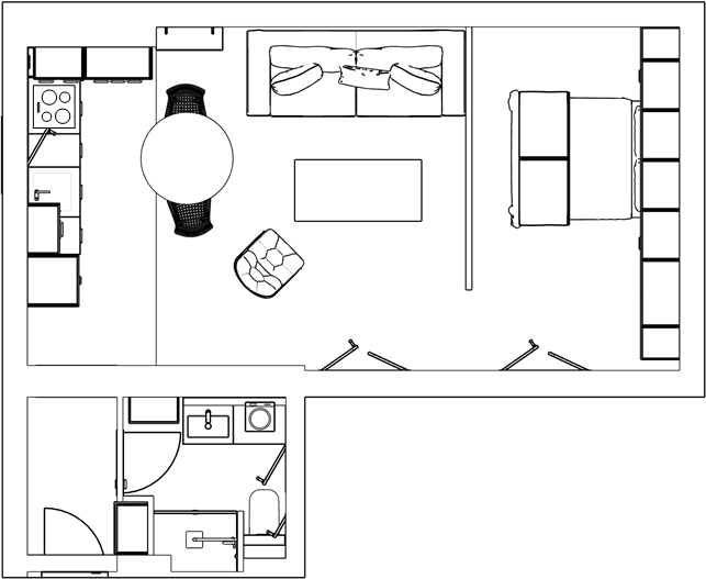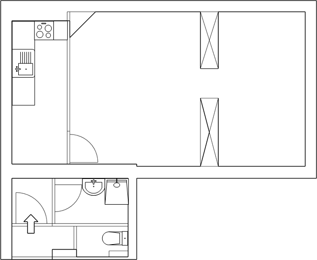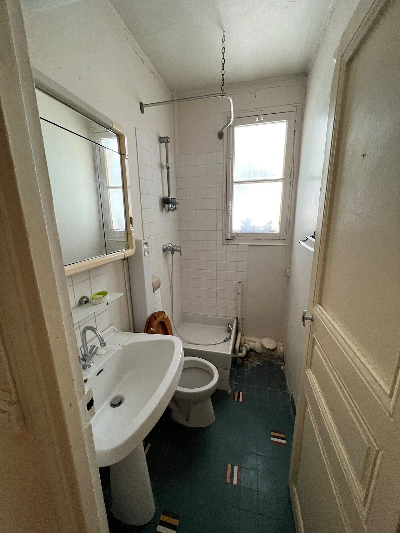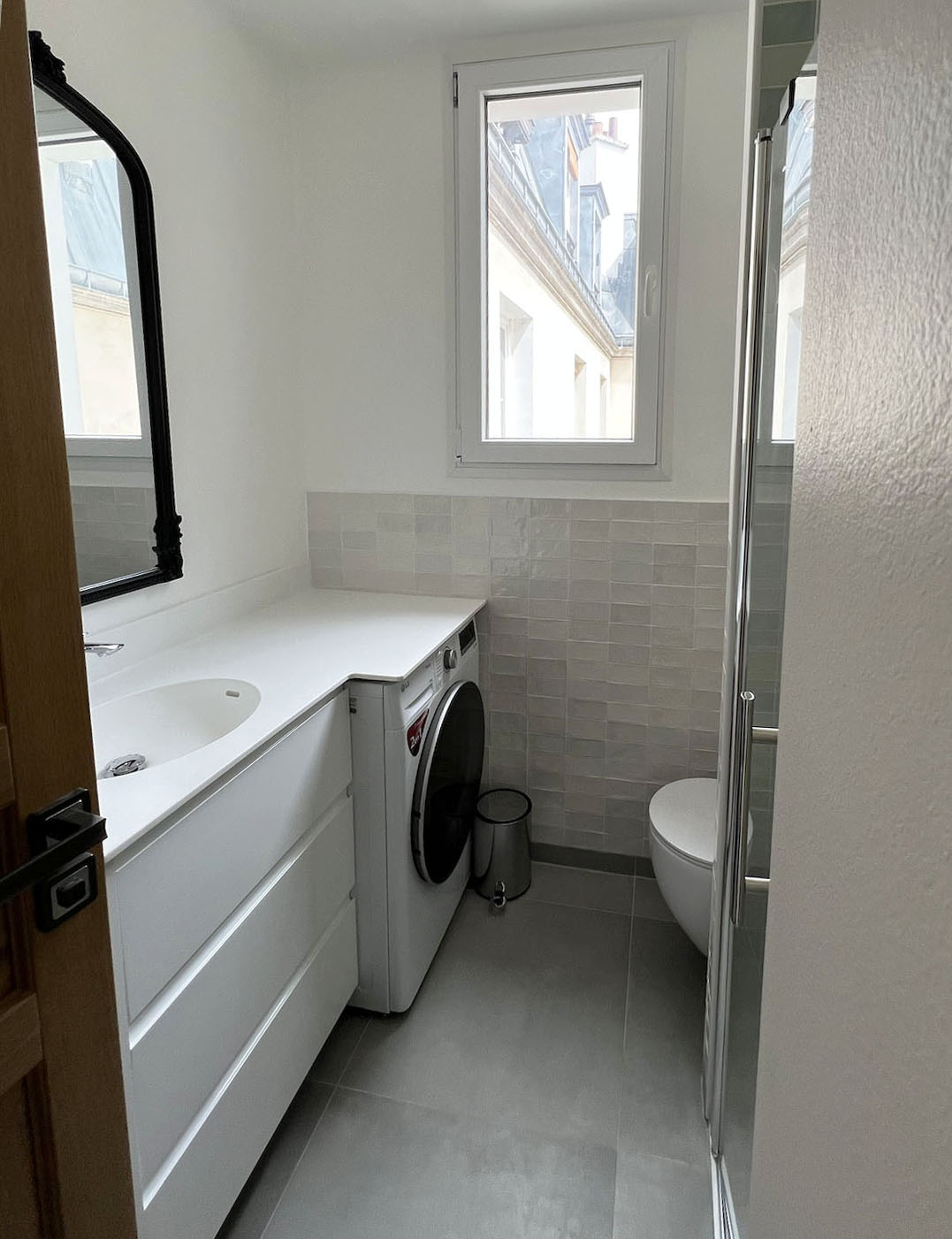 Ce studio parisien en forme de « L », au 5e étage en fond de cour et tout près de la Tour Eiffel, avait tout pour lui : traversant, lumineux, spacieux avec une belle hauteur sous plafond et une double exposition. Le potentiel était évident. Mais avec sa salle de bain vétuste, sa cuisine hors d’usage, ses toilettes sur le palier, sa distribution illisible et ses volumes étouffés, les enjeux en matière d’architecture d’intérieur étaient multiples. En outre, l’objectif affiché de notre client, un investisseur locatif doté d’une vraie stratégie, était de faire de ce logement un bien locatif positionné « haut de gamme » mais en conservant sa typologie, et donc son statut, de studio.