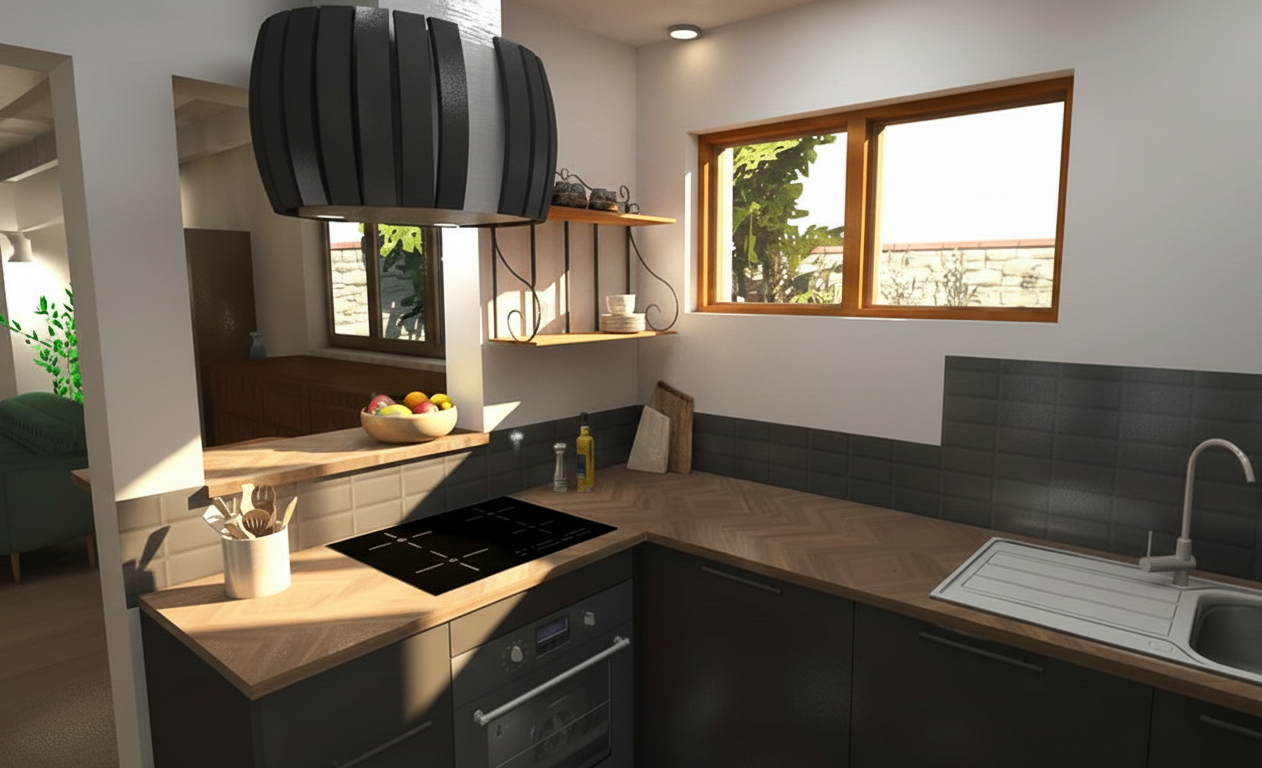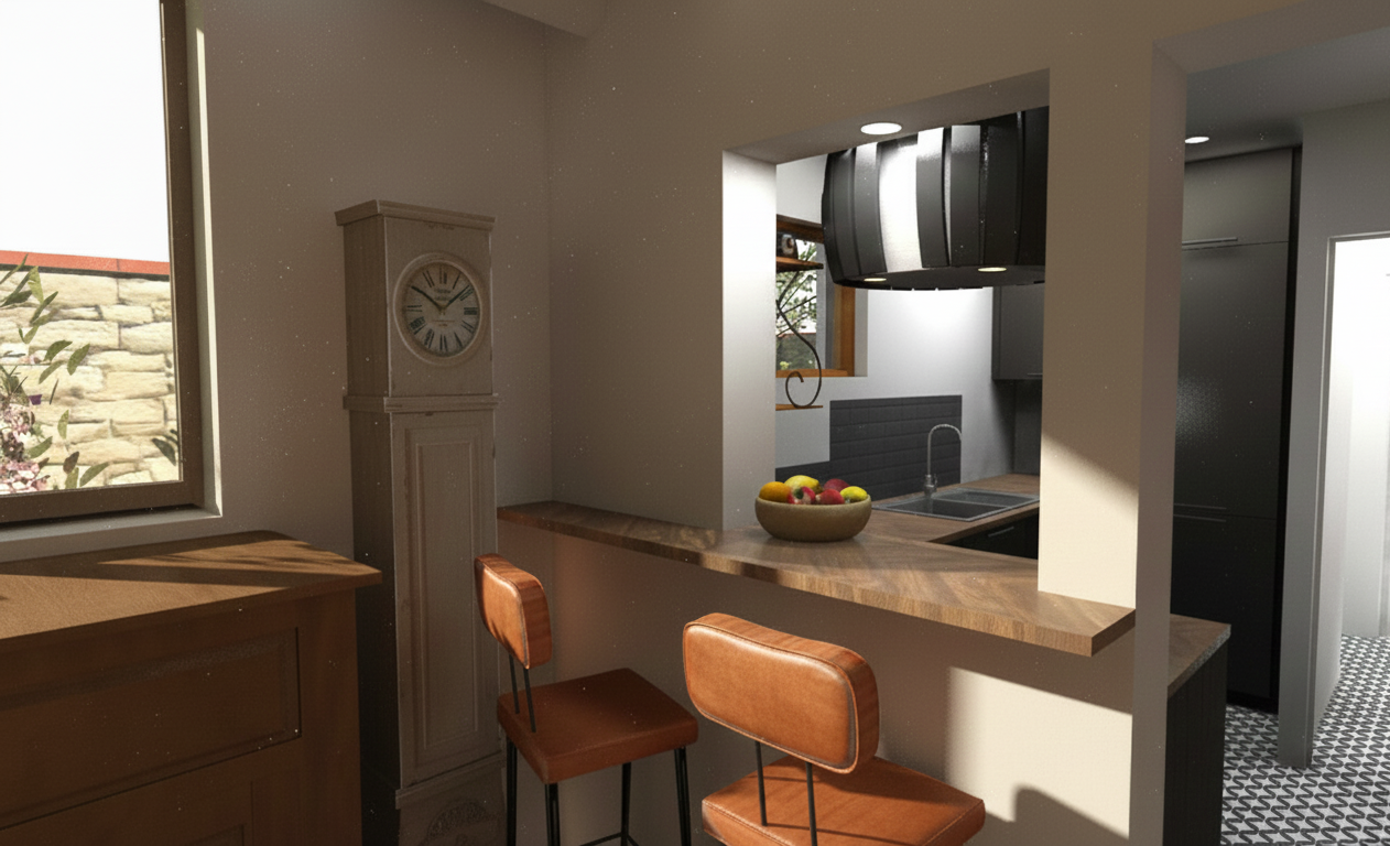 Projet 1 : il disposait bien d’un bar, mais, avec l’encombrement de l’électro-ménager, les rangements étaient en nombres limités.