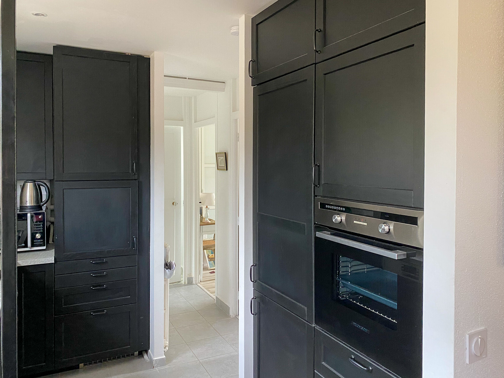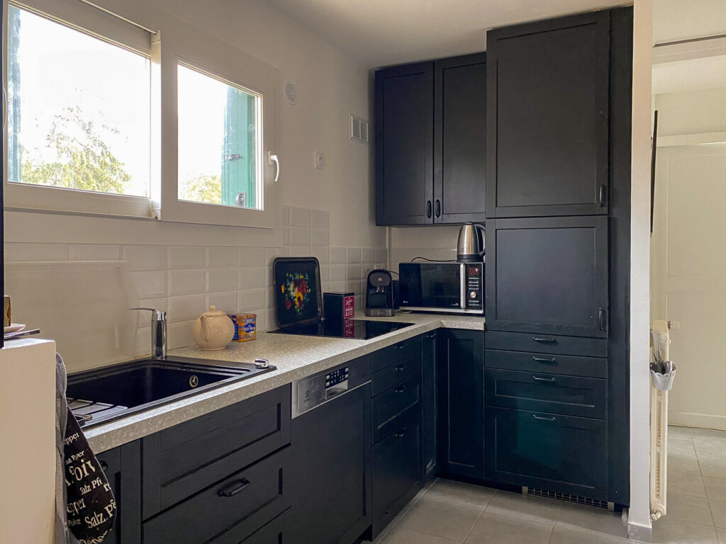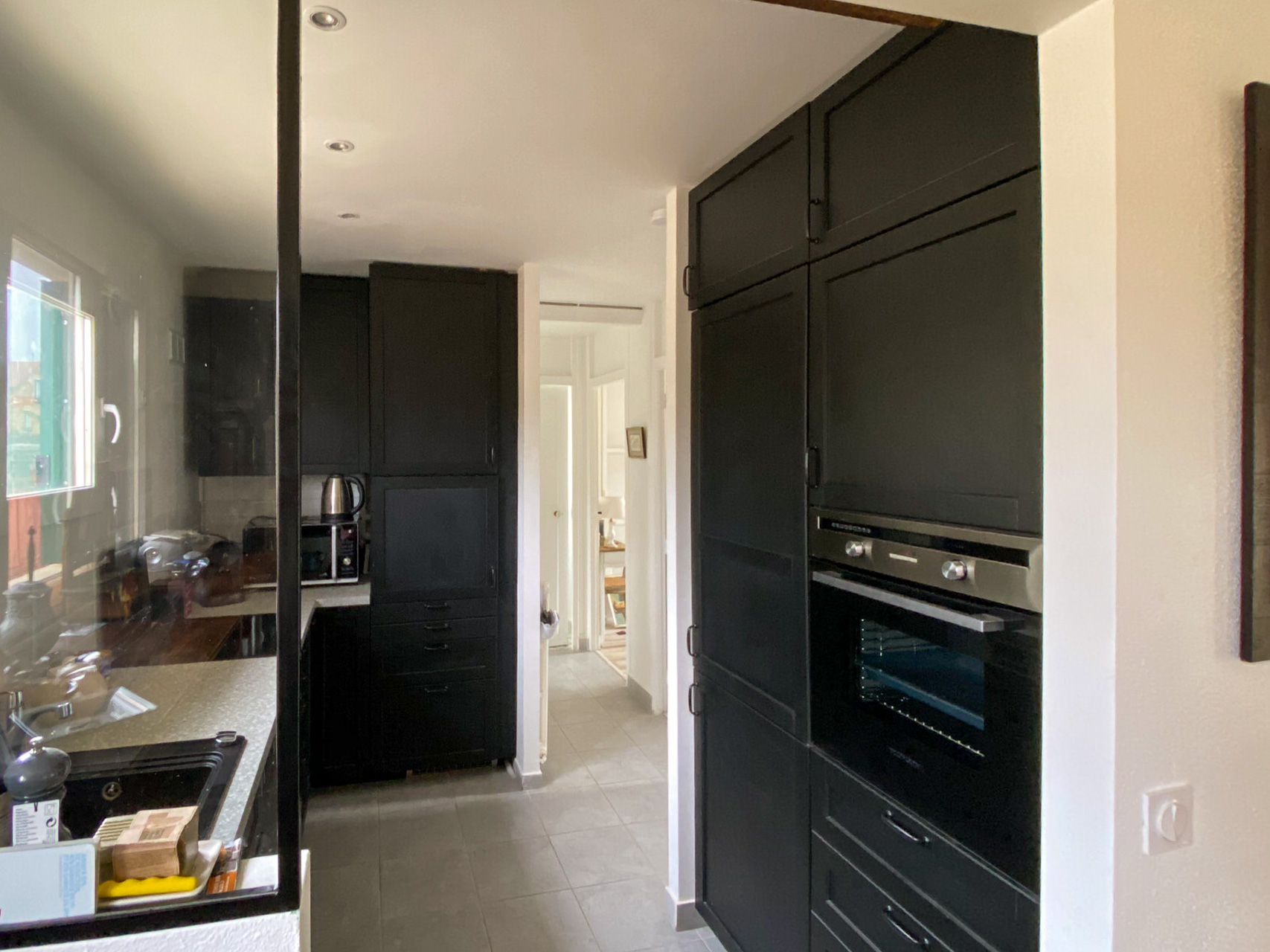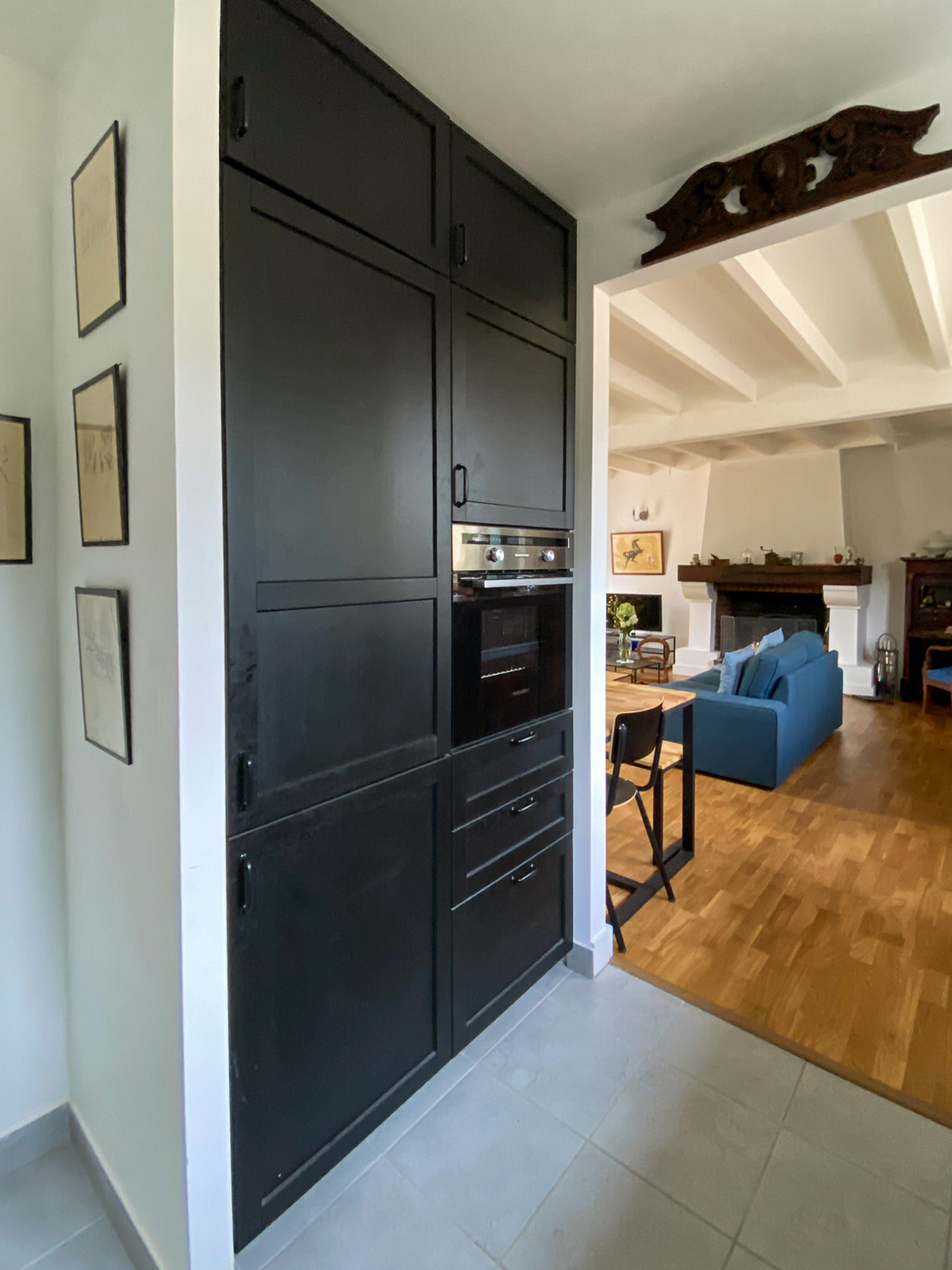 Fl* a choisi une cuisine IKEA Lerhyttan noire. Toutefois, les menuisiers ont dû faire preuve d’astuce et procéder à des aménagements sur mesure pour pouvoir cacher la chaudière et garantir un rendu harmonieux à la pièce.