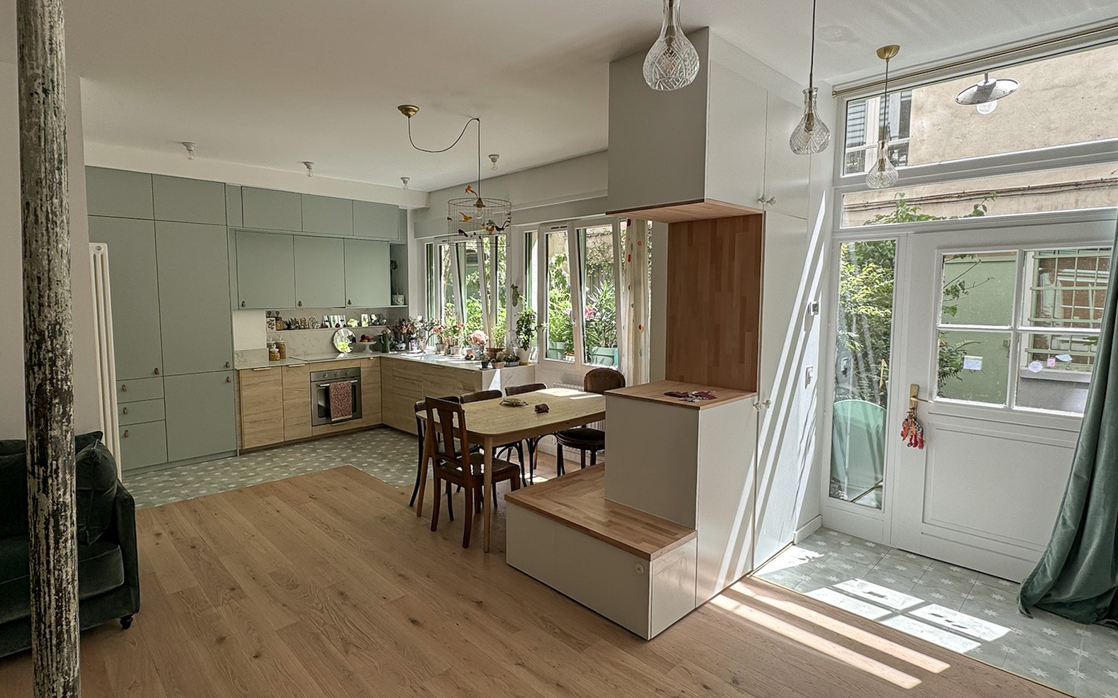Depuis son retour en France, Jul*, critique d’art et commissaire d’expositions, cherchait activement un appartement qui serait à la fois proche de l’école de sa fille et de sa propre mère. Jusqu’au jour où, le hasard faisant bien les choses, l’ancien cabinet médical situé juste en dessous de l’appartement de sa mère est mis en vente. Niché dans une cour arborée du 11e arrondissement, à deux pas de la Bastille, ce bien atypique réunissait tous les critères recherchés, à condition de savoir le transformer en un lieu de vie cosy pour sa fille et elle.