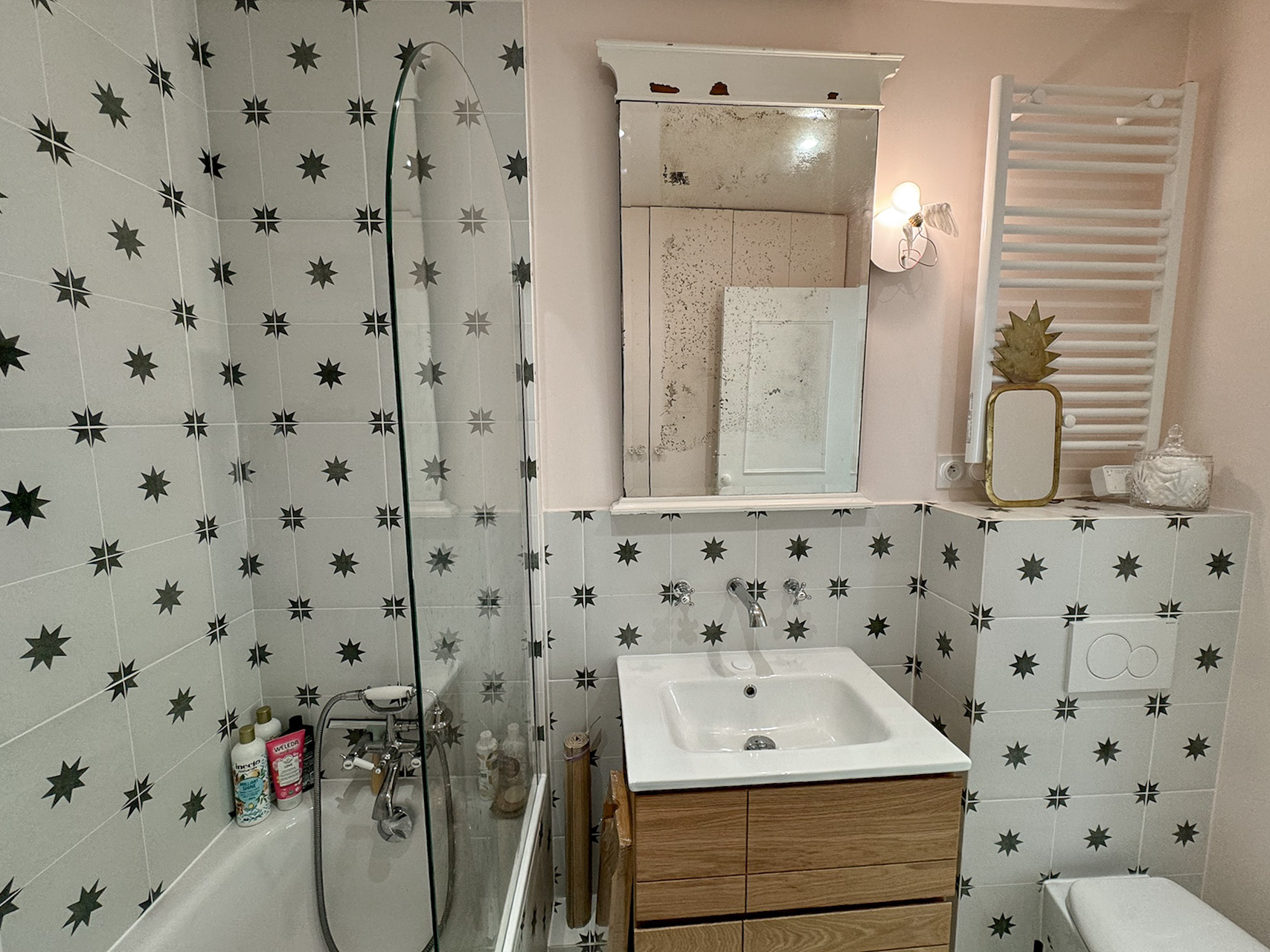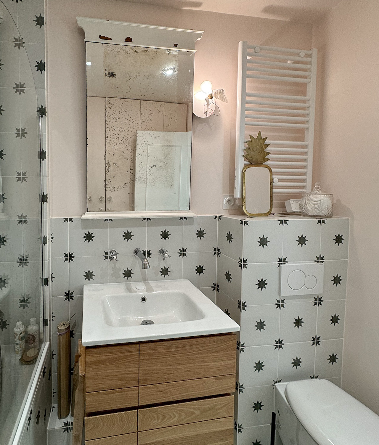 - Des couleurs pastel pour adoucir l’atmosphère, avec un rose poudré dans la salle de bain, et un violet parme dans la chambre, apportant une touche féminine et élégante.