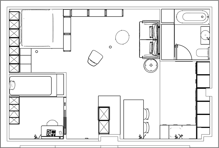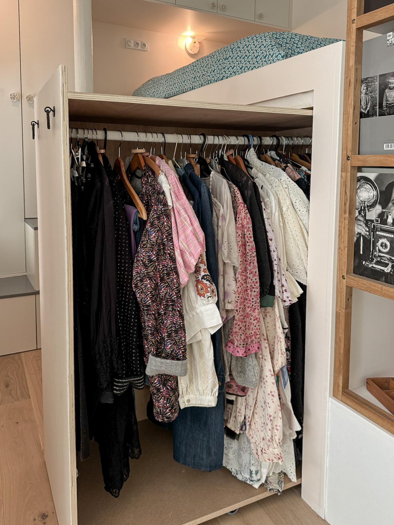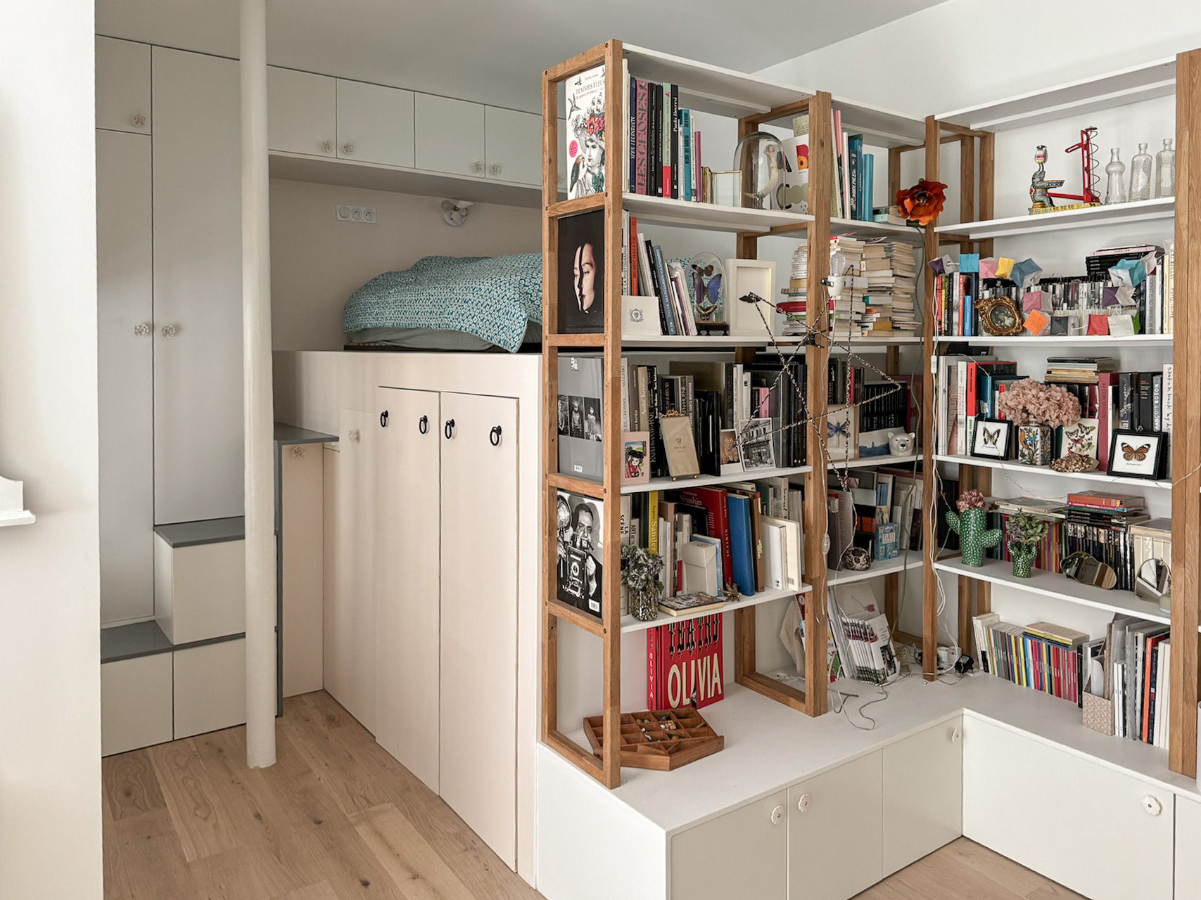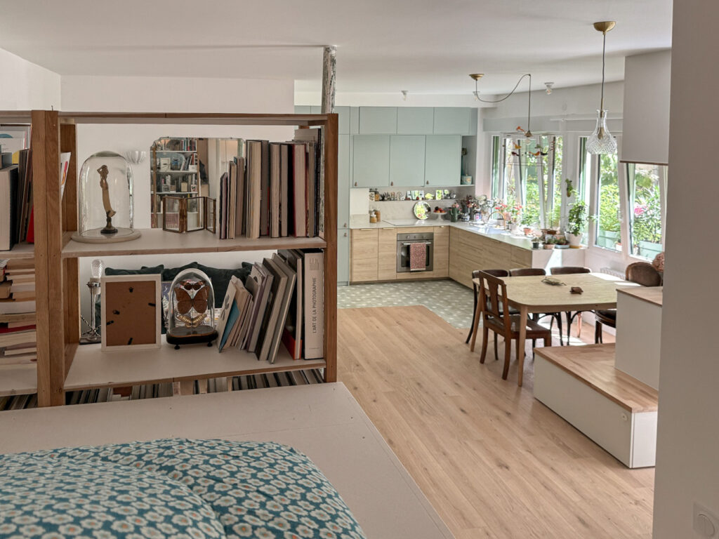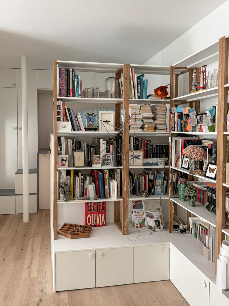 - Un coin nuit pour Jul*, sans fenêtre, dans un espace ouvert sur la pièce de vie. Ce coin est occupé par un module astucieux, entre estrade et mezzanine d’une hauteur d’1m60, flanqué d’un petit escalier en bois, ce qui permet de créer un espace en dessous et d’accueillir ainsi de grandes tringles et rangements coulissants, maximisant chaque mètre carré.