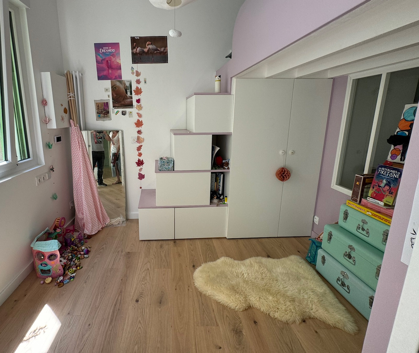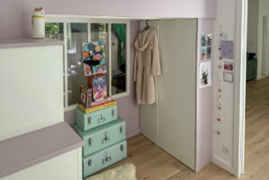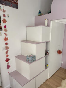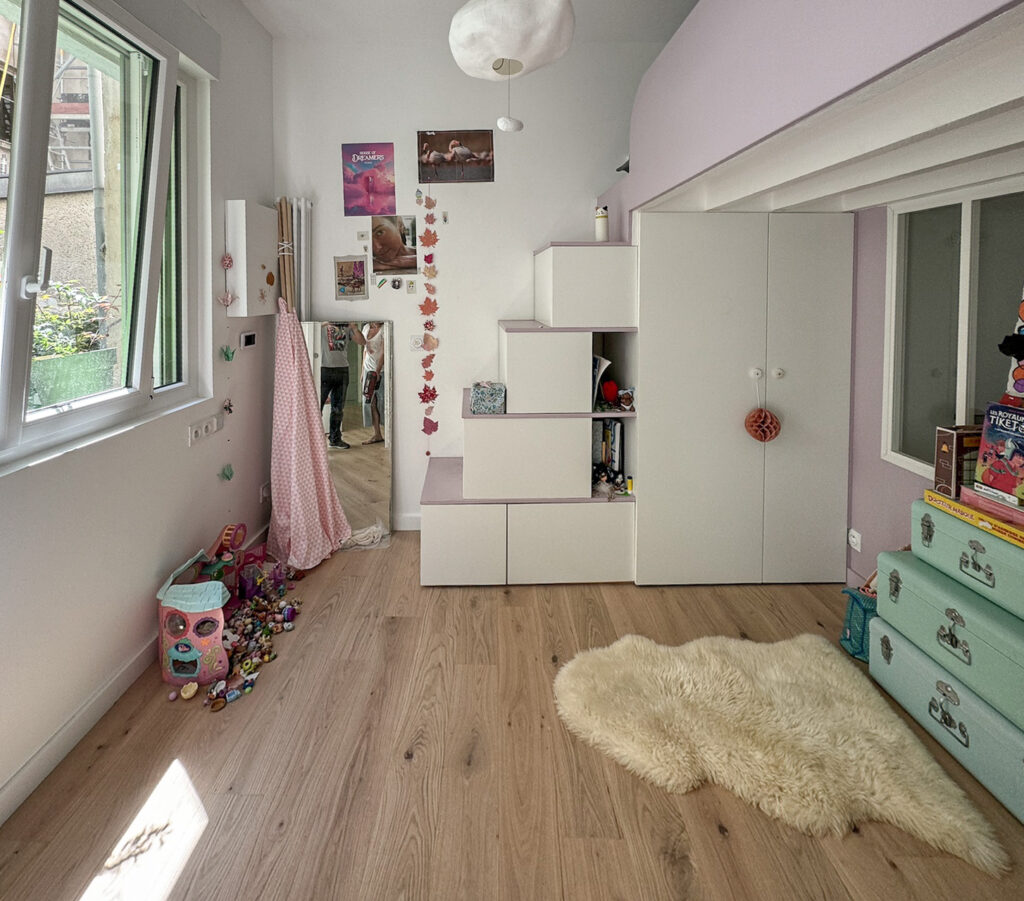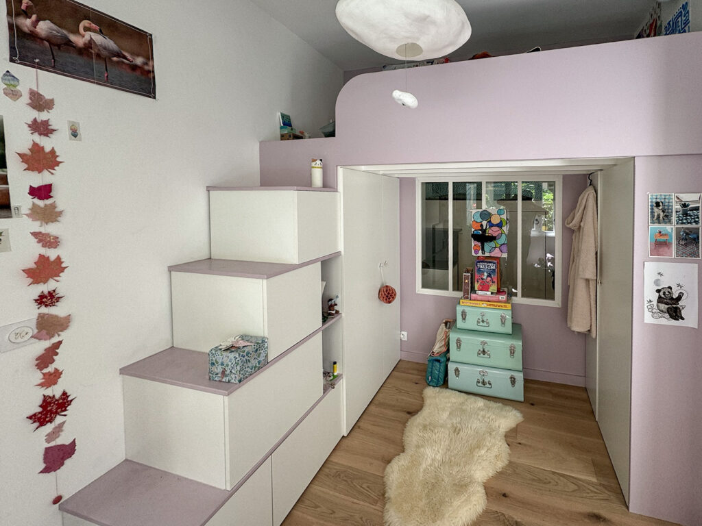- Une petite chambre pour sa fille en premier jour, offrant un espace privatif et cosy avec une mezzanine, des rangements intégrés et suffisamment d’espace pour recevoir ses amies.