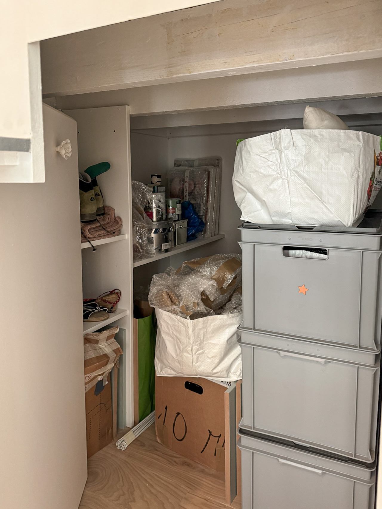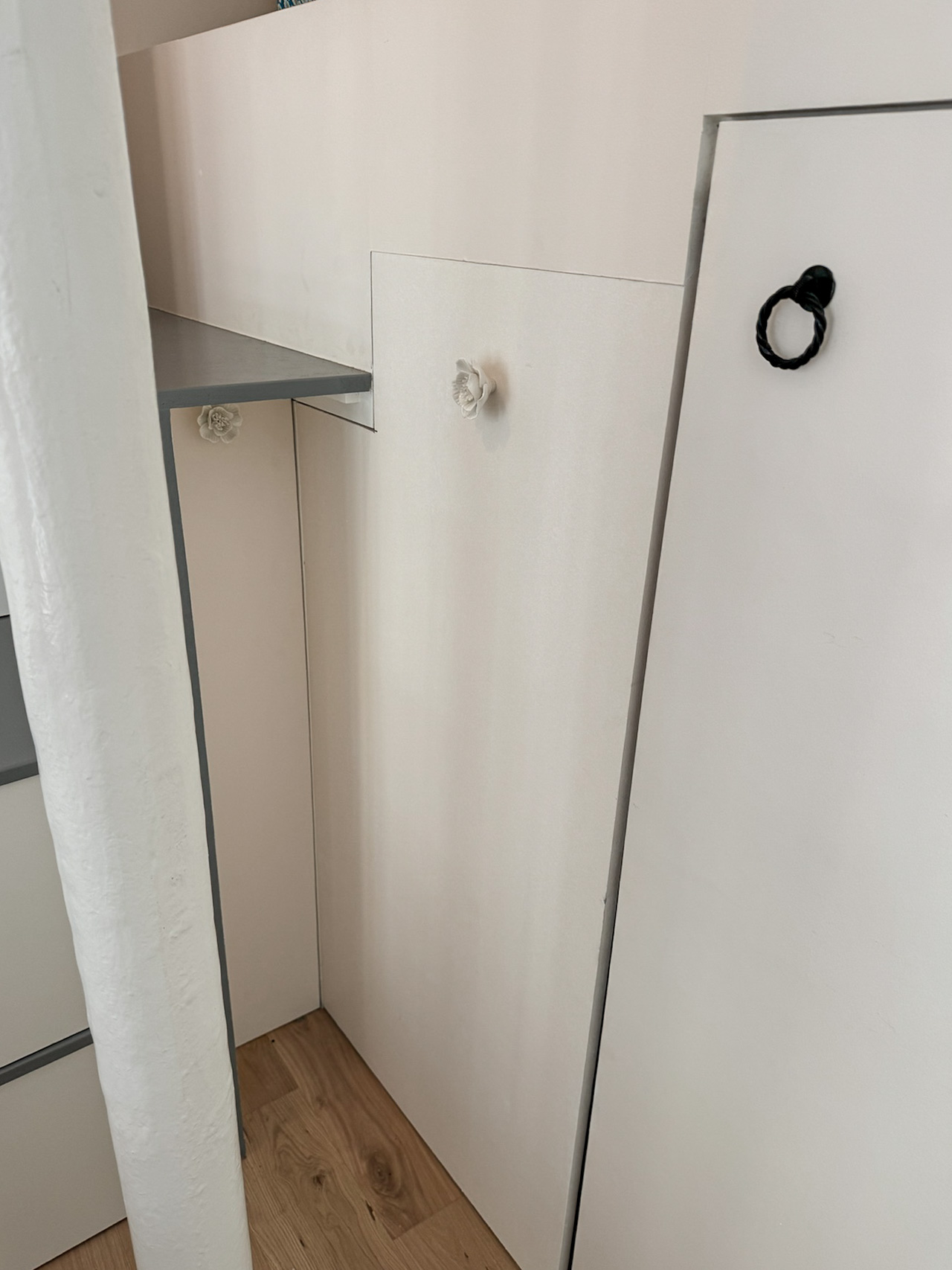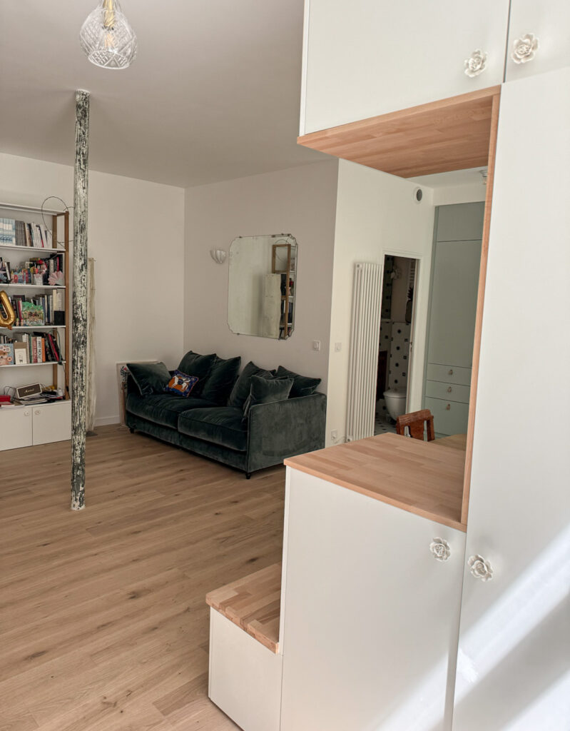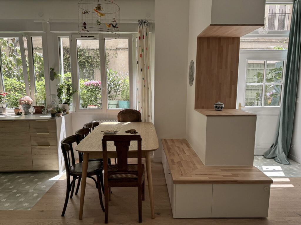 Lors de la séquence de démolition, une mauvaise surprise est apparue : les poutres du plafond étaient totalement vermoulues. Une intervention en urgence s’imposait, mais celle-ci relevait de la copropriété. Résultat : le chantier a été suspendu pendant près d’un an, le temps que ces réparations soient prises en charge et réalisées. Ces travaux ont tout de même engendré une petite contrainte budgétaire pour Jul* à laquelle nous nous sommes adaptés. Nous avons donc repris les plans des menuiseries pour passer de meubles sur mesures à de la demi mesure : utiliser des caissons du commerce et les modifier selon les besoins pour créer les différents rangements.