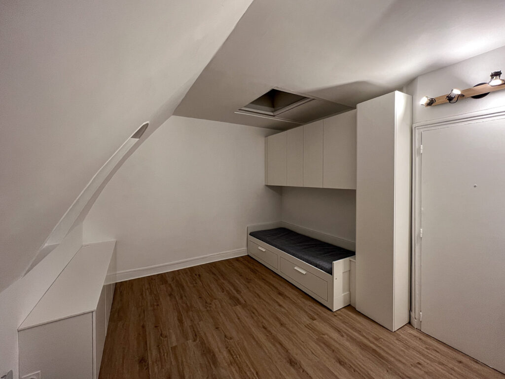 - Un placard adapté aux angles atypiques du studio, dissimulant le compteur électrique et offrant un espace penderie.