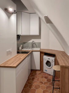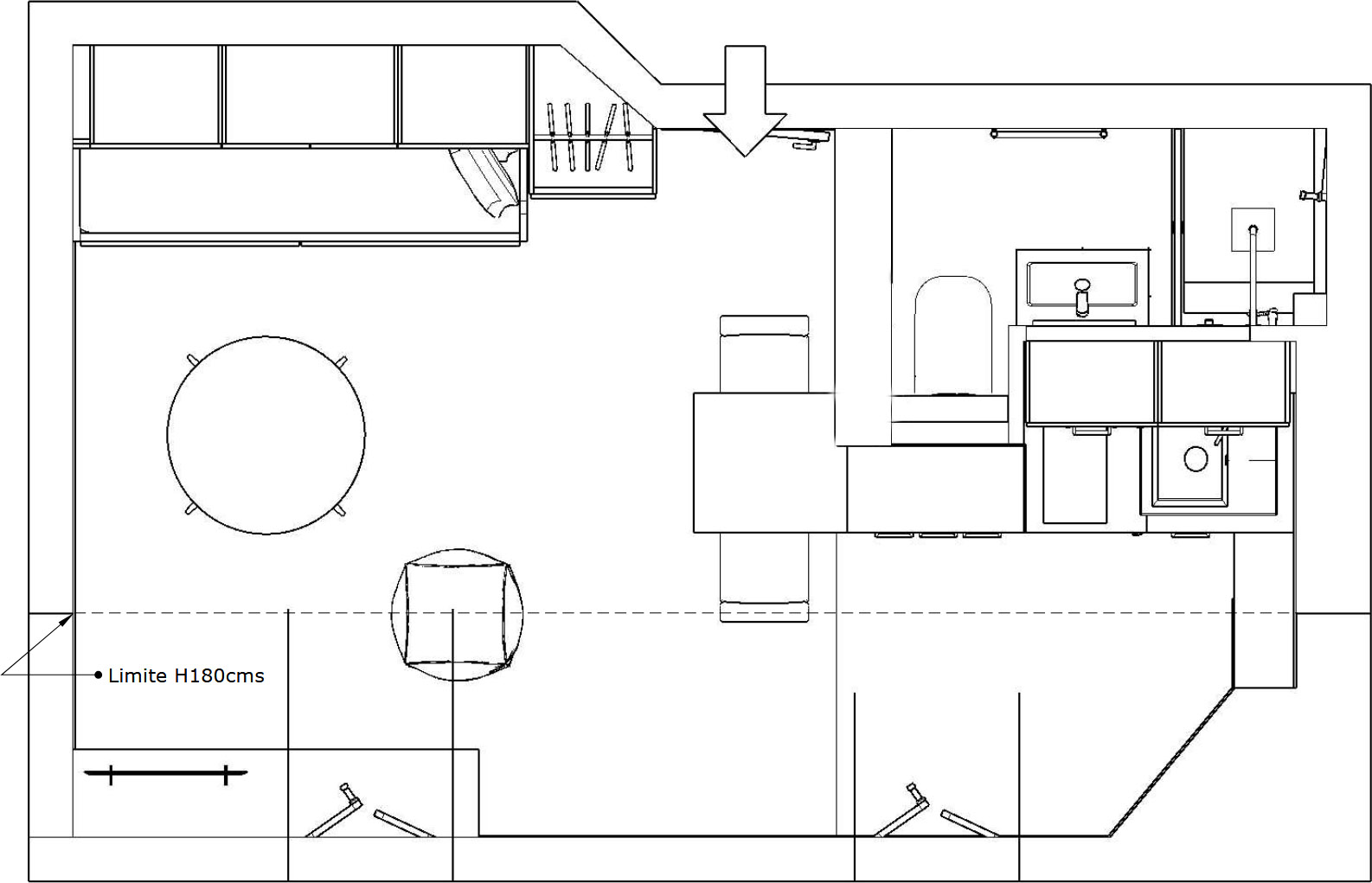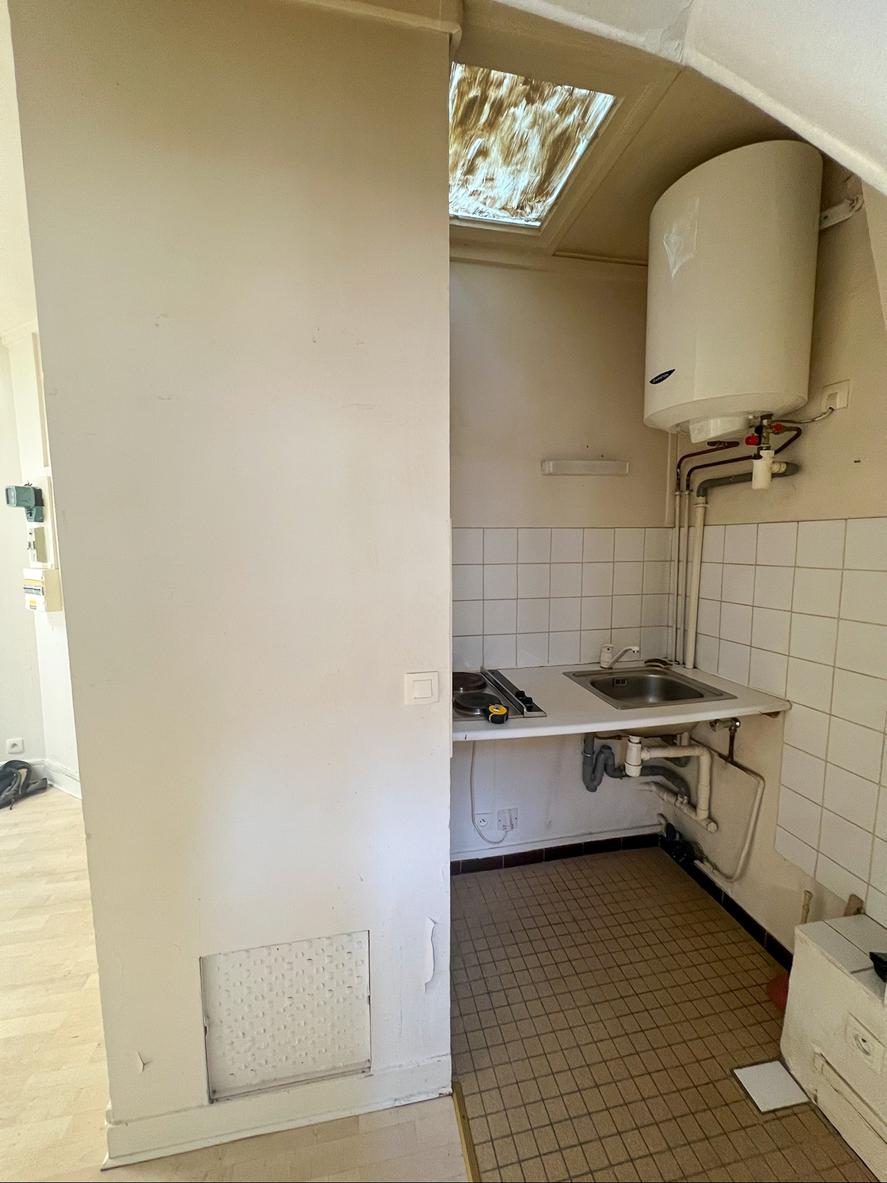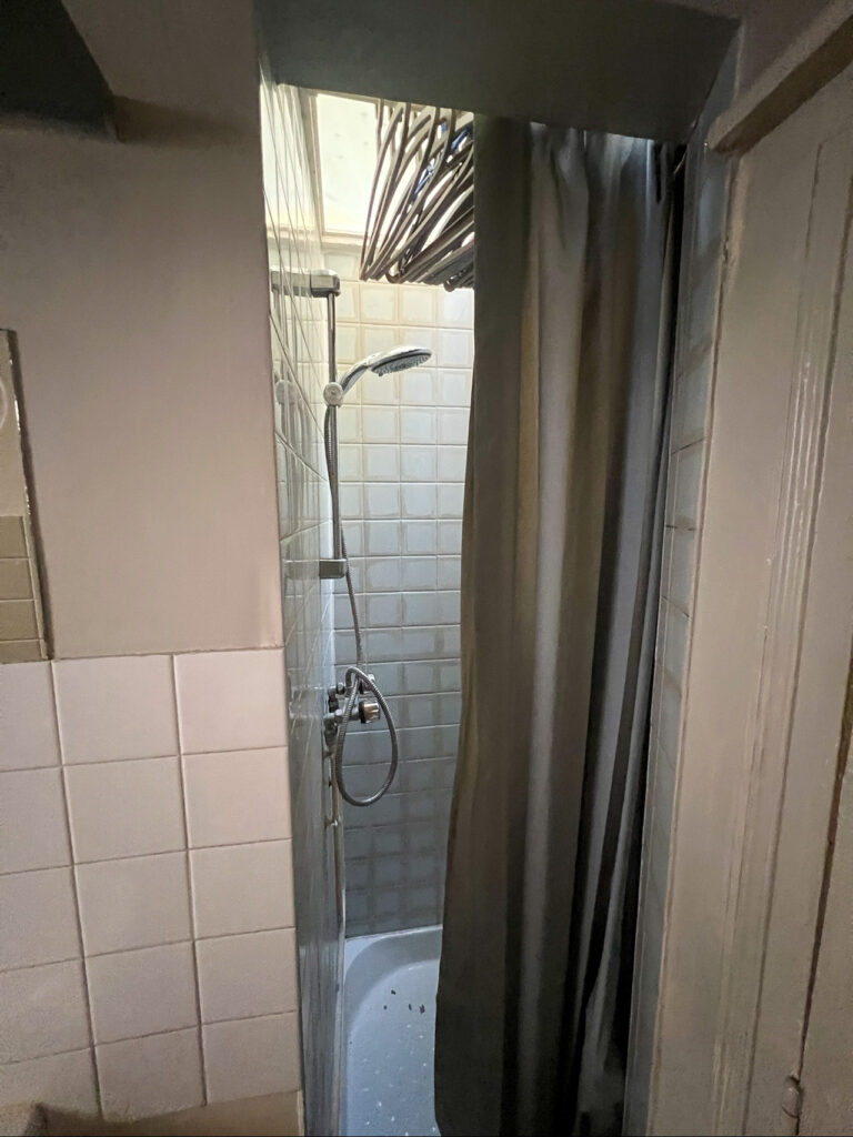- Une disposition incohérente, où une douche mal placée empiétait sur la cuisine et divisait l’espace de façon maladroite.