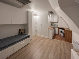 Dans un contexte où l’investissement locatif repose sur la capacité à révéler le potentiel de petites surfaces, ce studio sous les toits représentait une gageure. Difficile d’imaginer qu’un appartement sombre, mal isolé et au plan chaotique puisse devenir un cocon lumineux et rationalisé.