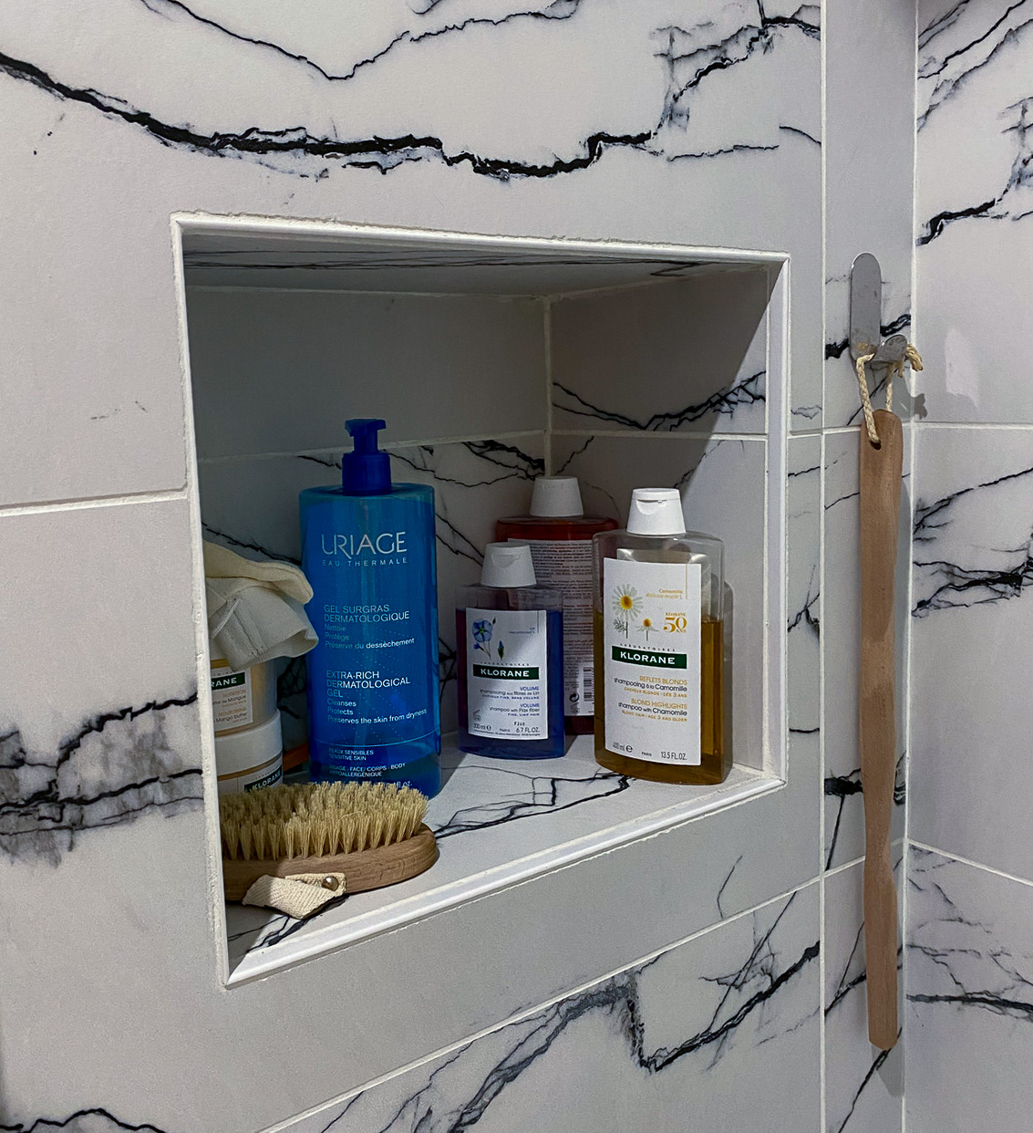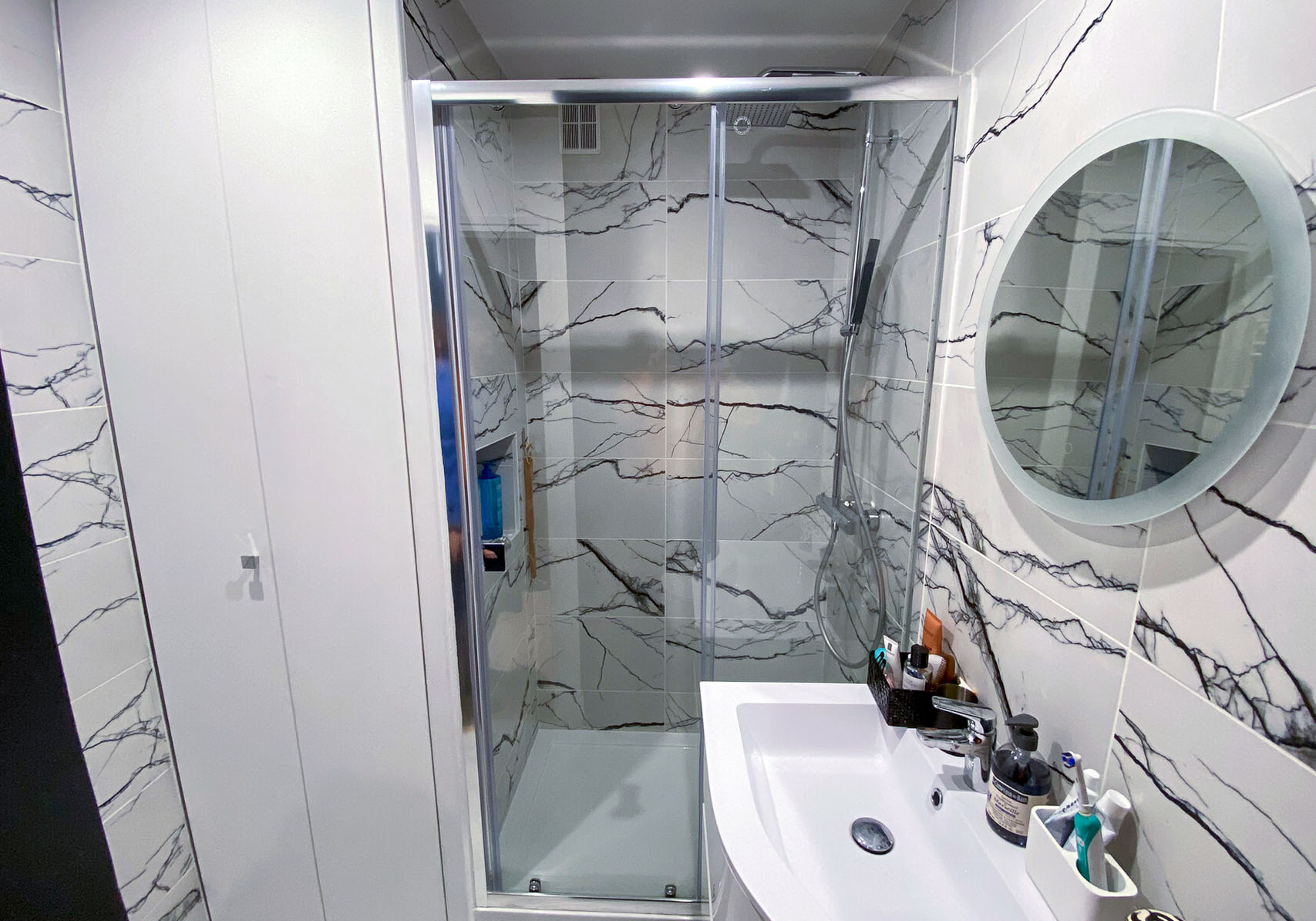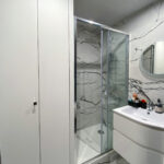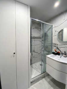Une douche de 110x70cms a été installée avec une niche pour les produits de toilettes, ainsi qu’un placard accueillant le linge de maison et une machine à laver lavante/séchante. Petit gadget pour se préparer de bonne humeur, le miroir embarque un haut parleur bluetooth.