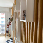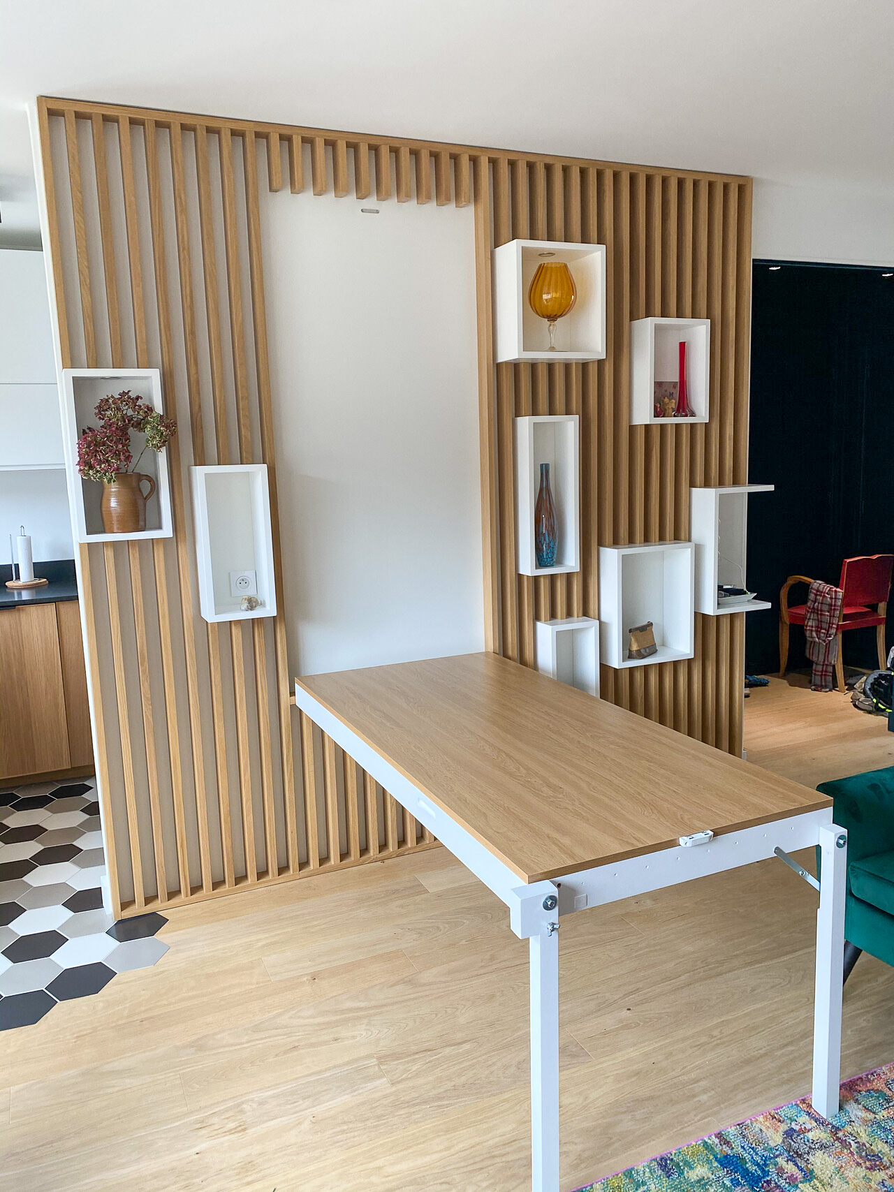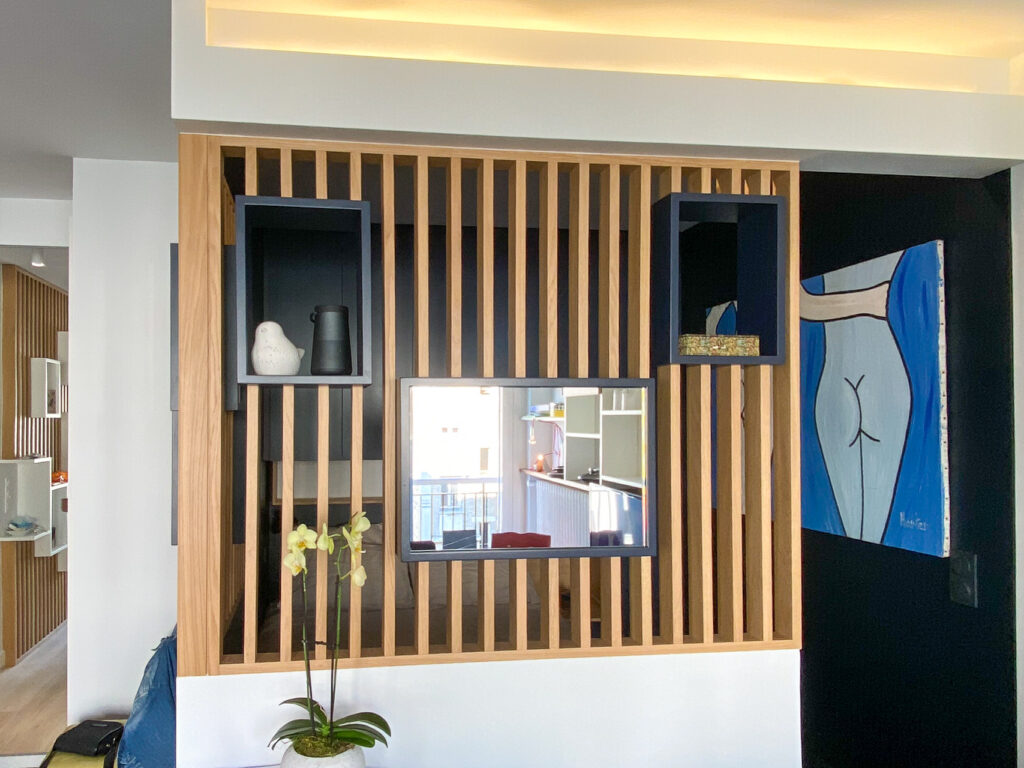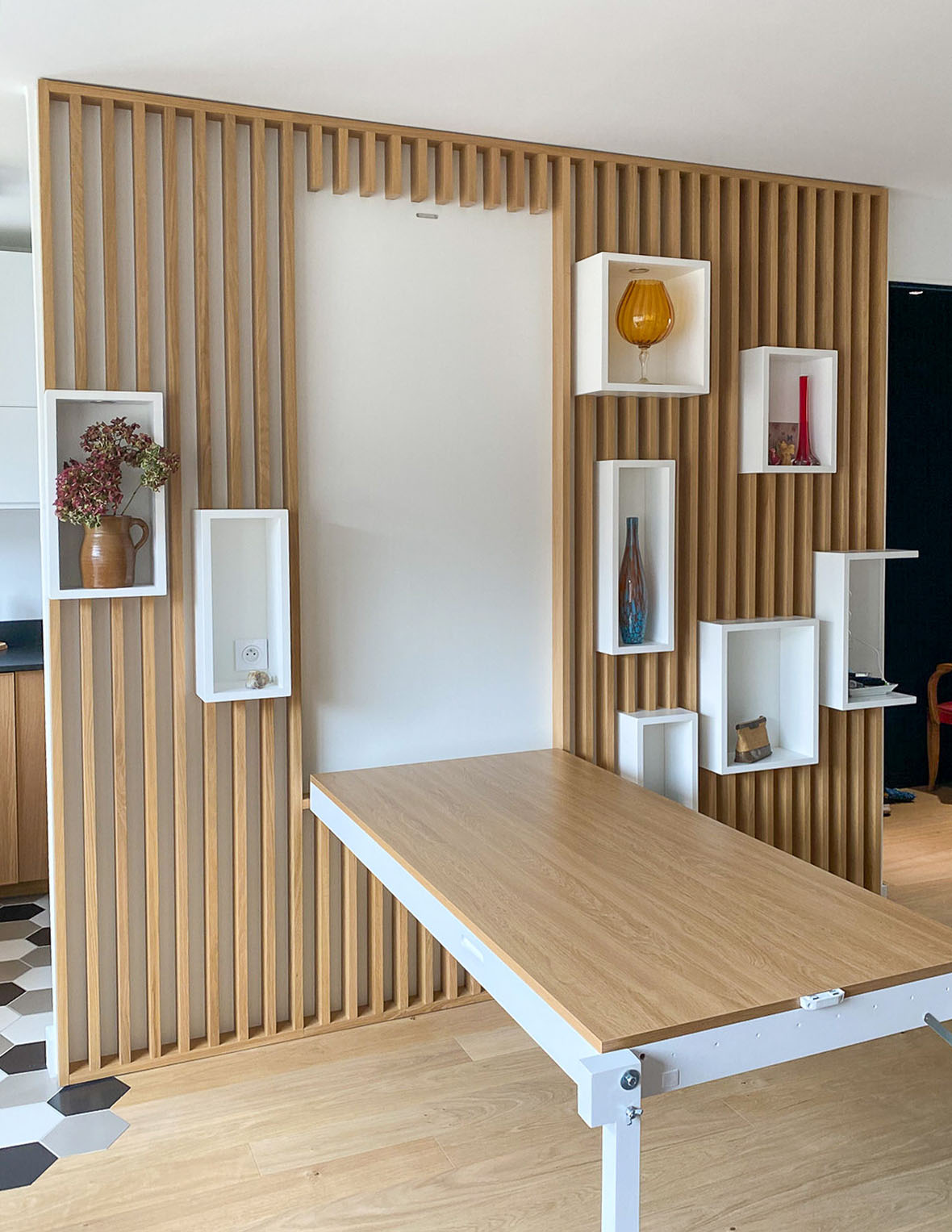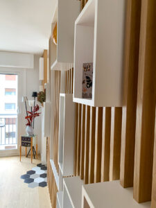 Enfin, la fameuse table escamotable, construite sur mesure et dissimulée dans un claustra en trompe l’œil, permettra à Al* de moduler sa pièce à vivre entre un salon confortable ou un espace salle à manger pour recevoir à dîner.