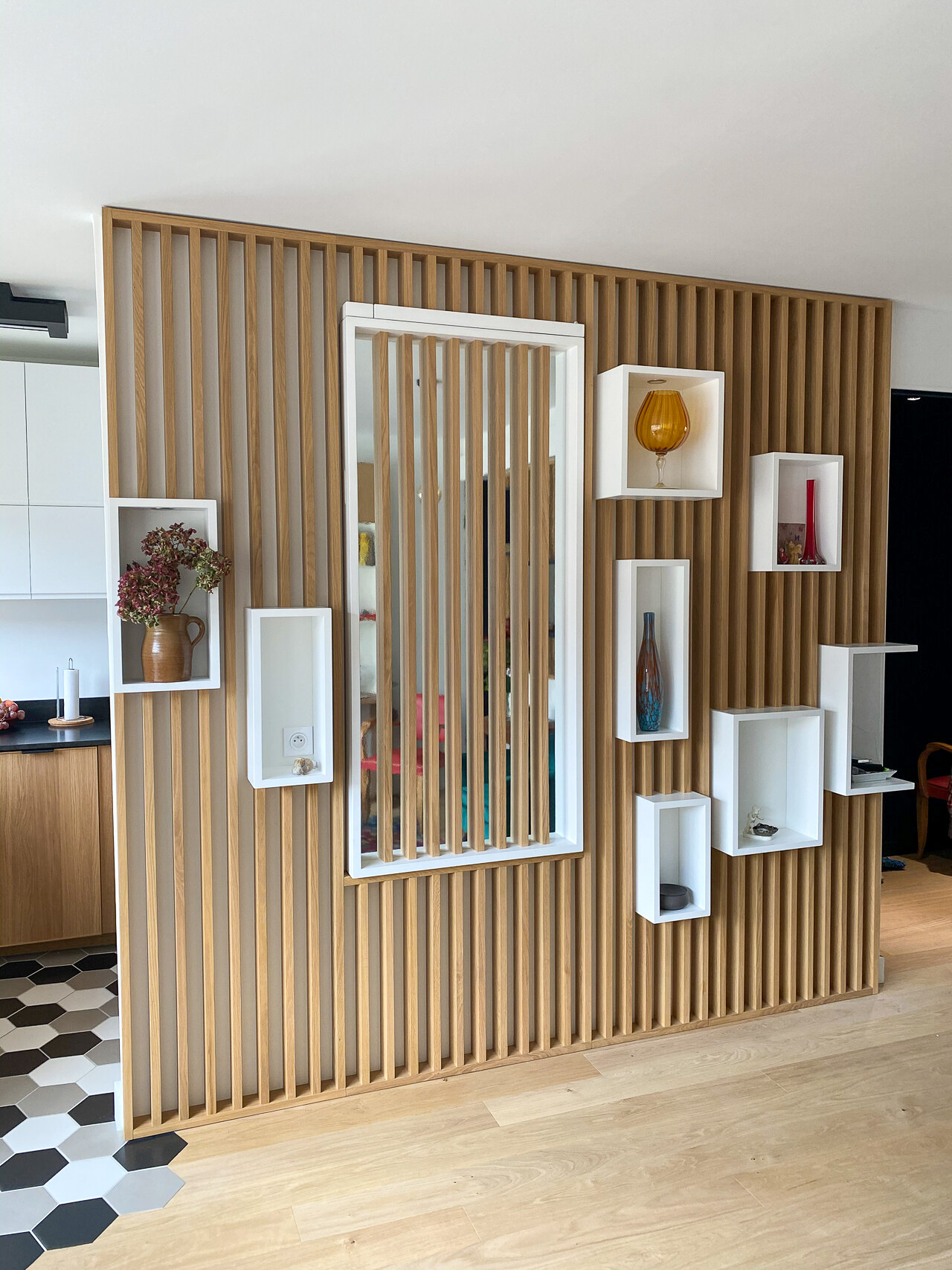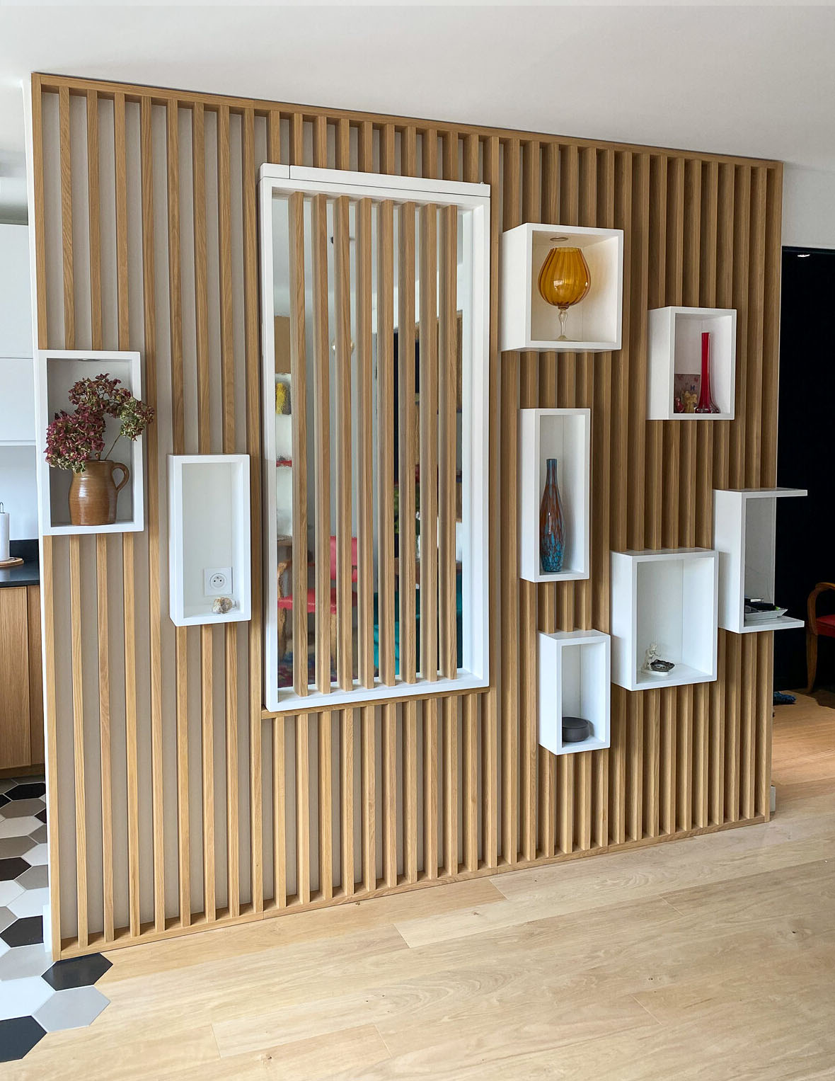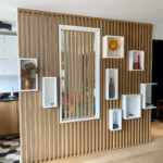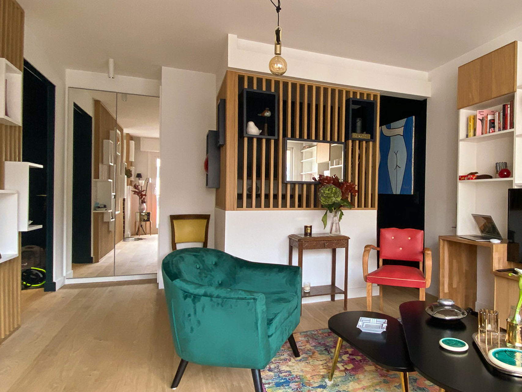 Enfin, la fameuse table escamotable, construite sur mesure et dissimulée dans un claustra en trompe l’œil, permettra à Al* de moduler sa pièce à vivre entre un salon confortable ou un espace salle à manger pour recevoir à dîner.