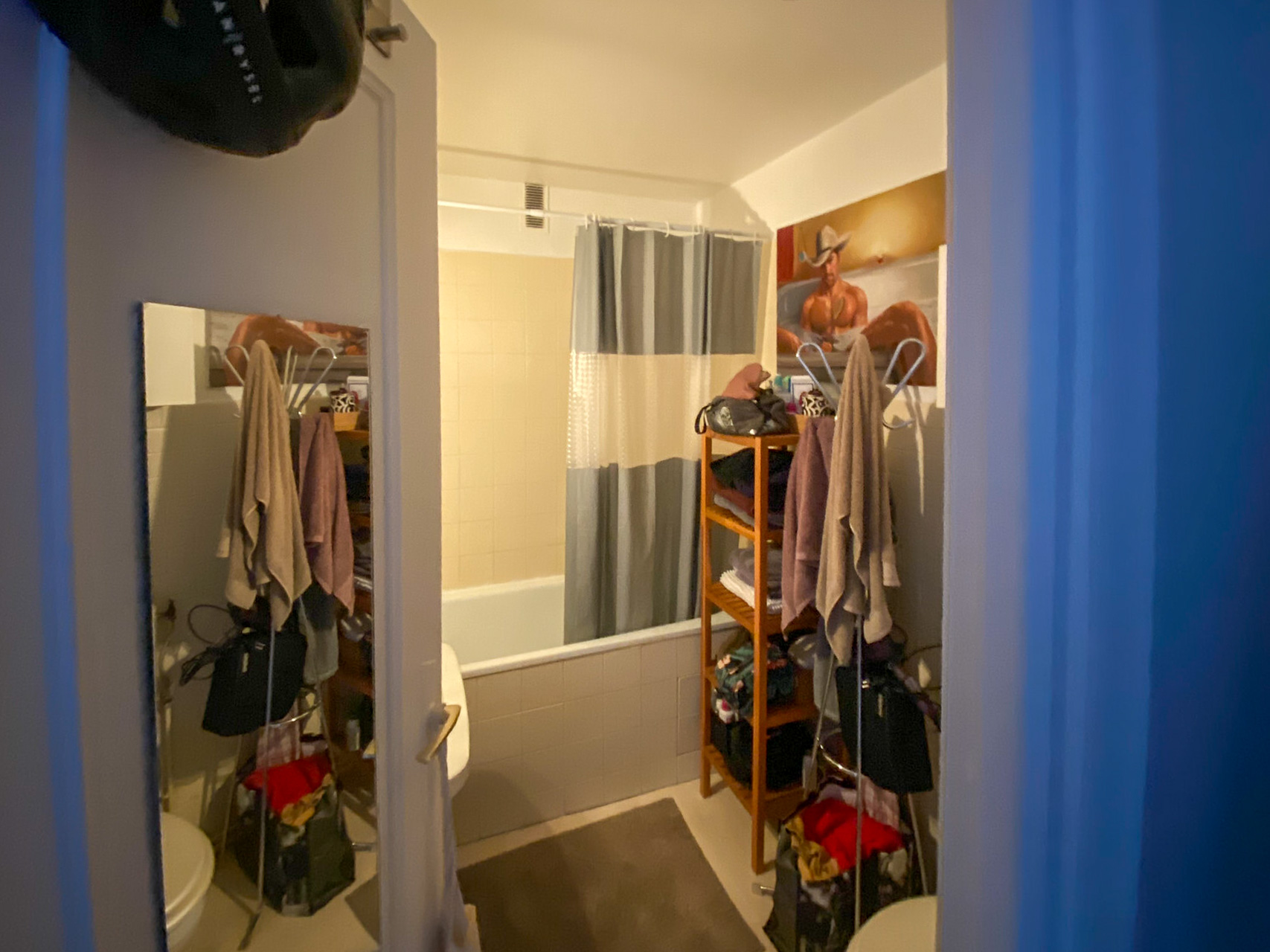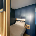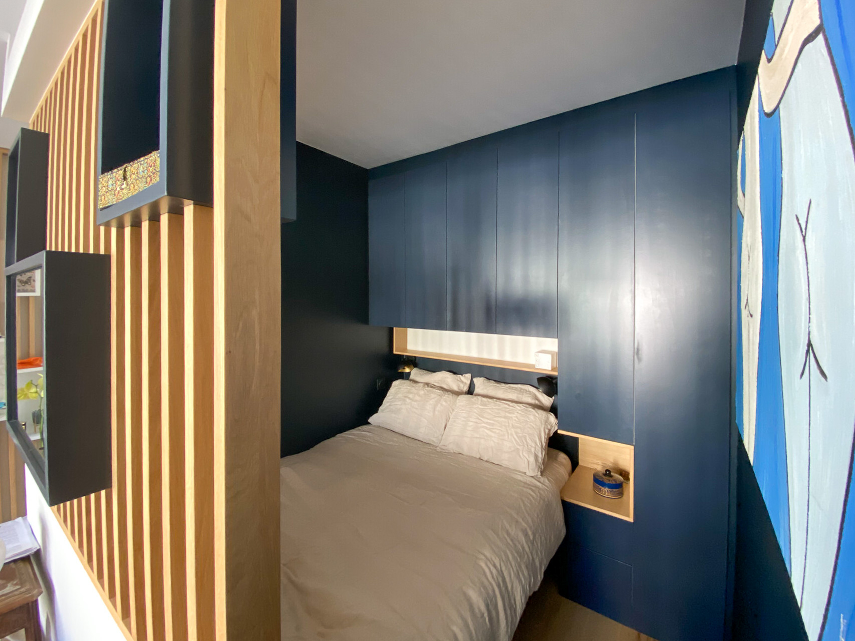 Des placards ont été agencés tout autour du lit pour disposer d’un grand nombre de rangements. Un mécanisme de serrure dissimulée permettra a Al* de ranger ses affaires à l’abri des guests AirBnB lorsqu’il partira en vacances.