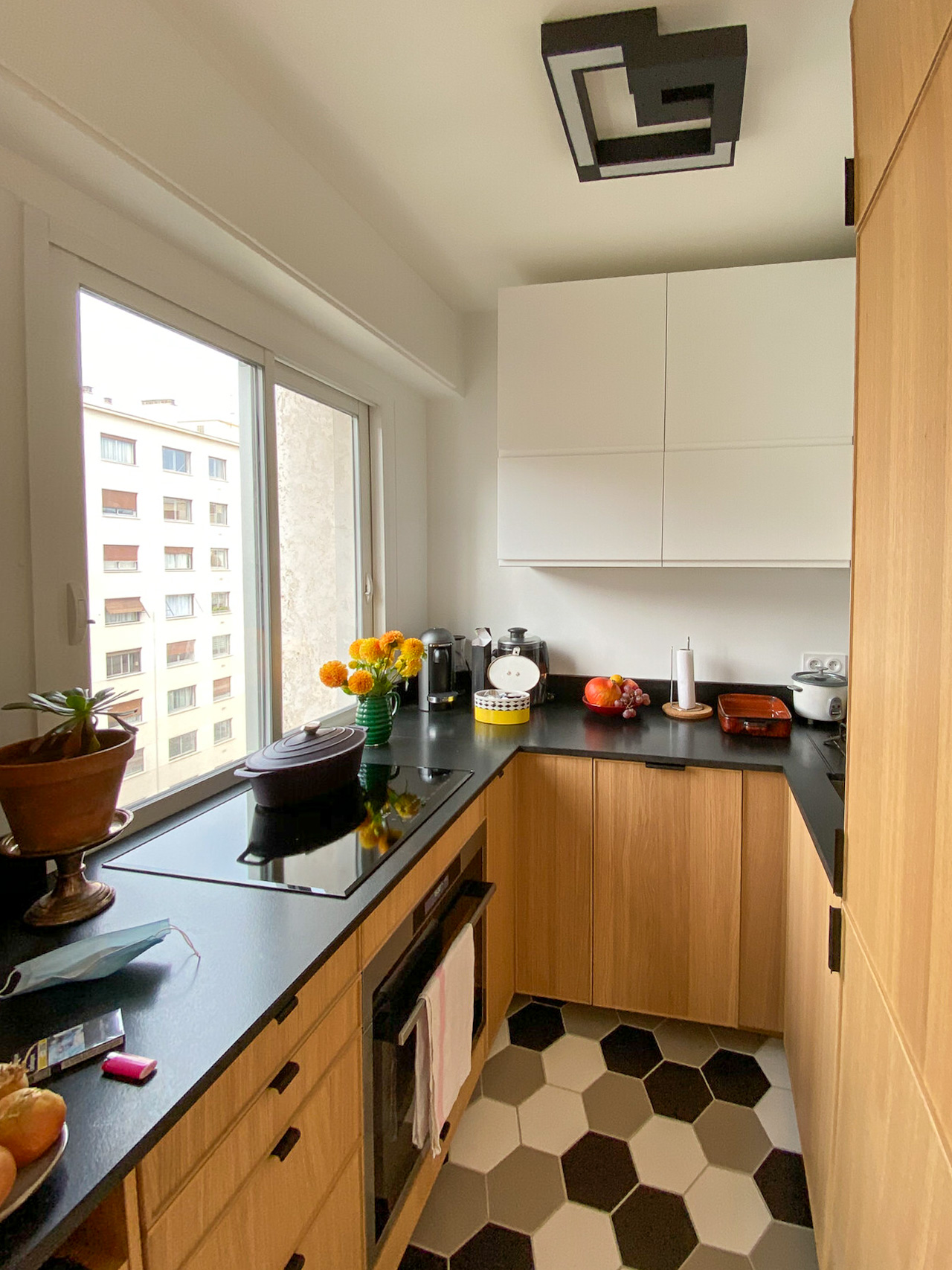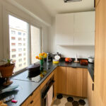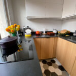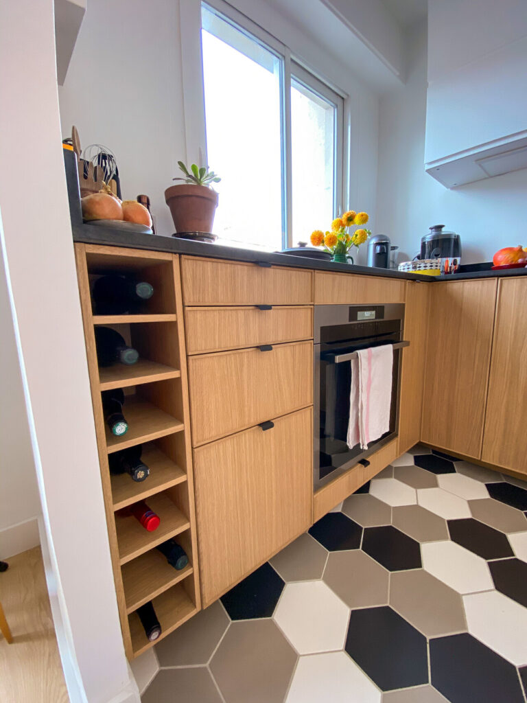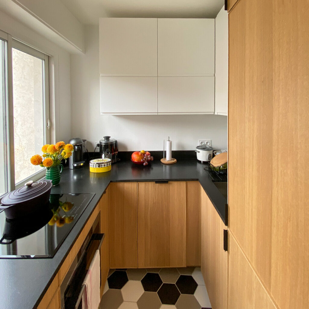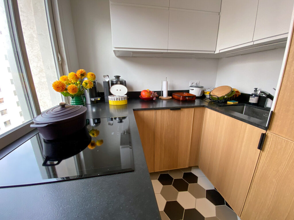 La cuisine a également été repensée pour accueillir un grand frigo/congélateur, un lave vaisselle, une plaque de cuisson 4 feux et un four vapeur. Un micro-onde est également caché dans un placard. Le plan de travail en granit noir du Zimbabwe apporte une touche de minéralité dans cet univers de bois.