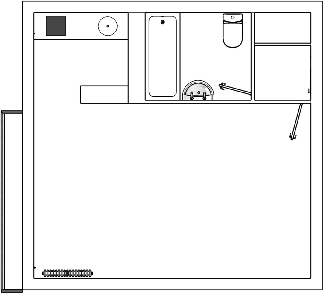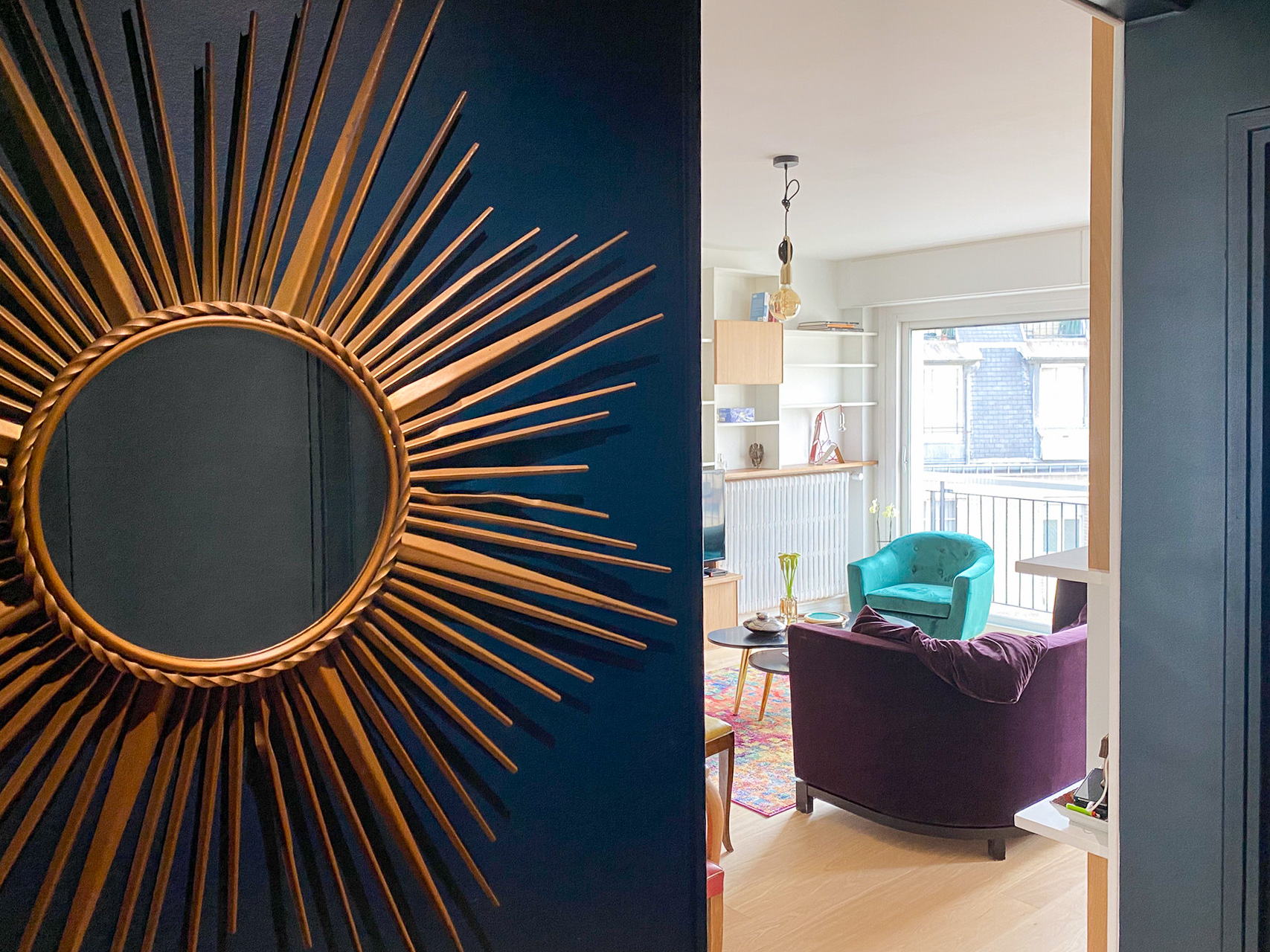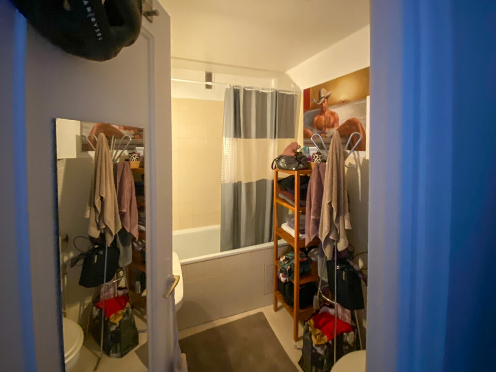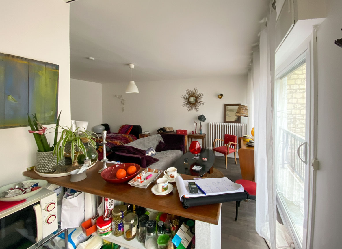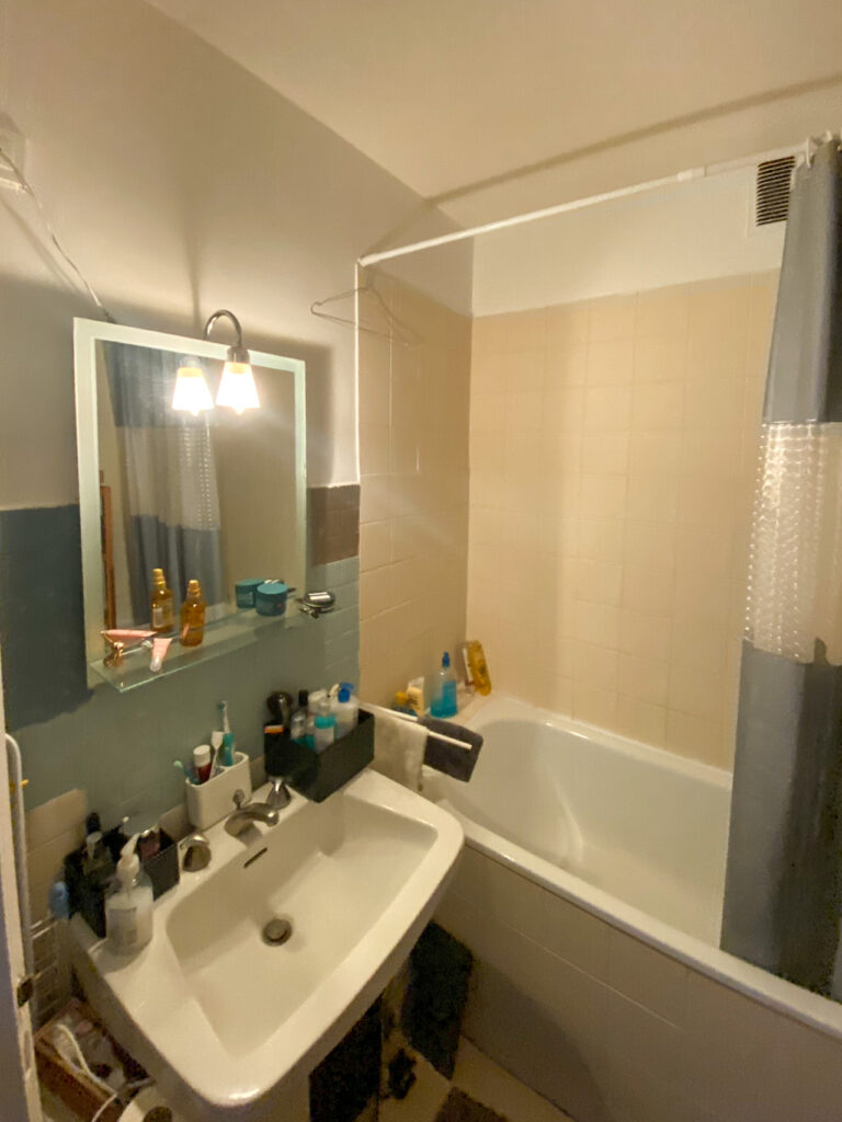 Au 7ème étage d’un immeuble des années 60, l’appartement bénéficie de la lumière émanant d’une grande baie vitrée donnant sur le jardin intérieur. La petite entrée desservait la salle de bain et la pièce de vie. La cuisine, quant à elle, se trouvait dans un renfoncement, séparée par un bar. Dans la salle de bain, les toilettes, visibles depuis l’entrée attiraient le regard. Il fallait trouver un moyen de les dissimuler.