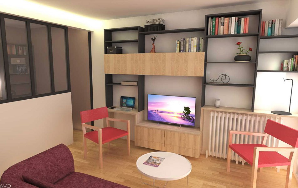Habitant depuis 2 mois dans son grand studio de 35m², Al* nous a contacté car il souhaitait revoir son aménagement et surtout créer un véritable coin nuit. Quelques rangements complémentaires étaient également les bienvenus.