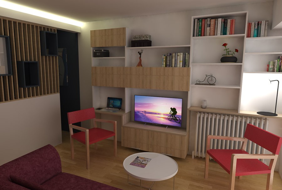 Projet 1 : un lit sur estrade, et un salon transformable en salle à manger avec une table escamotable dissimulée dans un claustra.