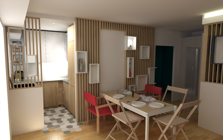 Séduit par les deux approches, Al* a choisi de mixer tous les éléments des propositions avec un espace chambre derrière des claustras, mais en gardant la table escamotable du salon : un projet très graphique, à la fois cosy et pratique, dans un style scandinave affirmé.