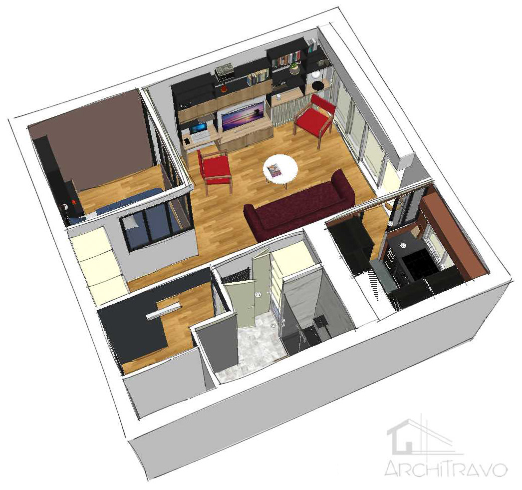 Le cahier des charges d’Al* était, a priori, simple : une cuisine fonctionnelle, une table de repas, un coin bureau et une « chambre ». Le tout dans 35m². Et tant qu’à faire, on pouvait essayer d’y mettre aussi une verrière.