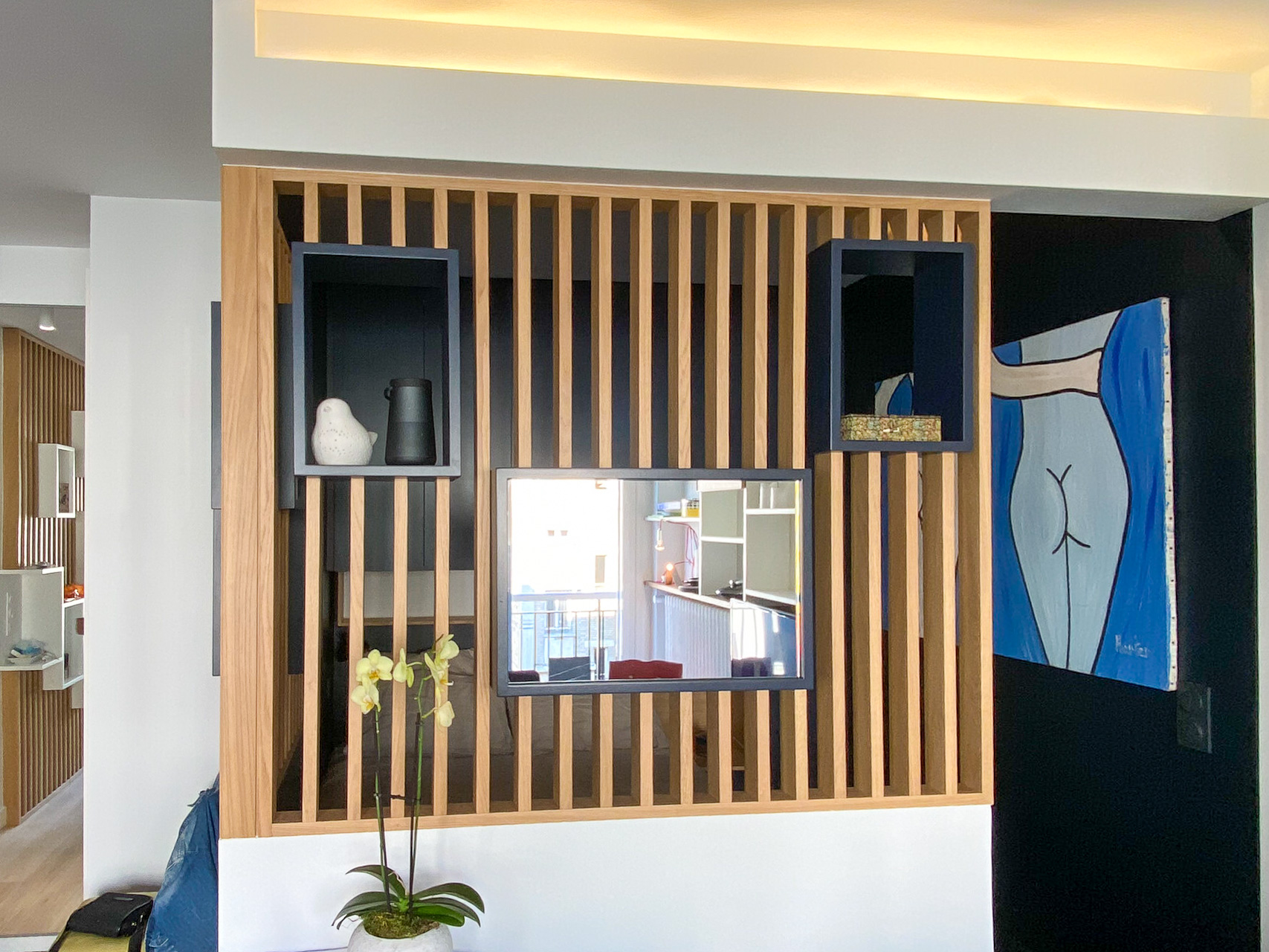 La séparation entre le coin nuit et le salon a donc été assurée par le montage d’un claustra. Le soir, une corniche éclairée par un bandeau LED offre une ambiance tamisée dans le salon.